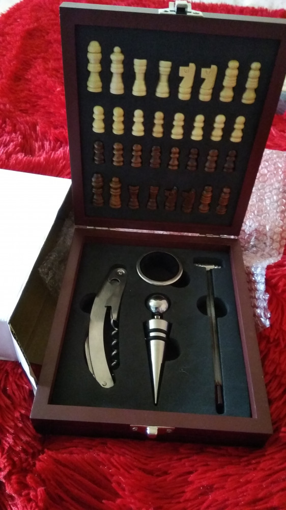 Набор для вина, 4 предмета (шахматы + термометр + кольцо + открывалка + пробка)В данный момент этот товар отсутствует в продаже. Возможно, у нас найдется аналогичный или похожий товар здесь. Последнее время стало модным иметь дома мини – бар. Неважно сколько там вариантов напитков, два или двадцать, такие инструменты как пробка, открывалка, кольцо и спиртометр просто необходимы. |