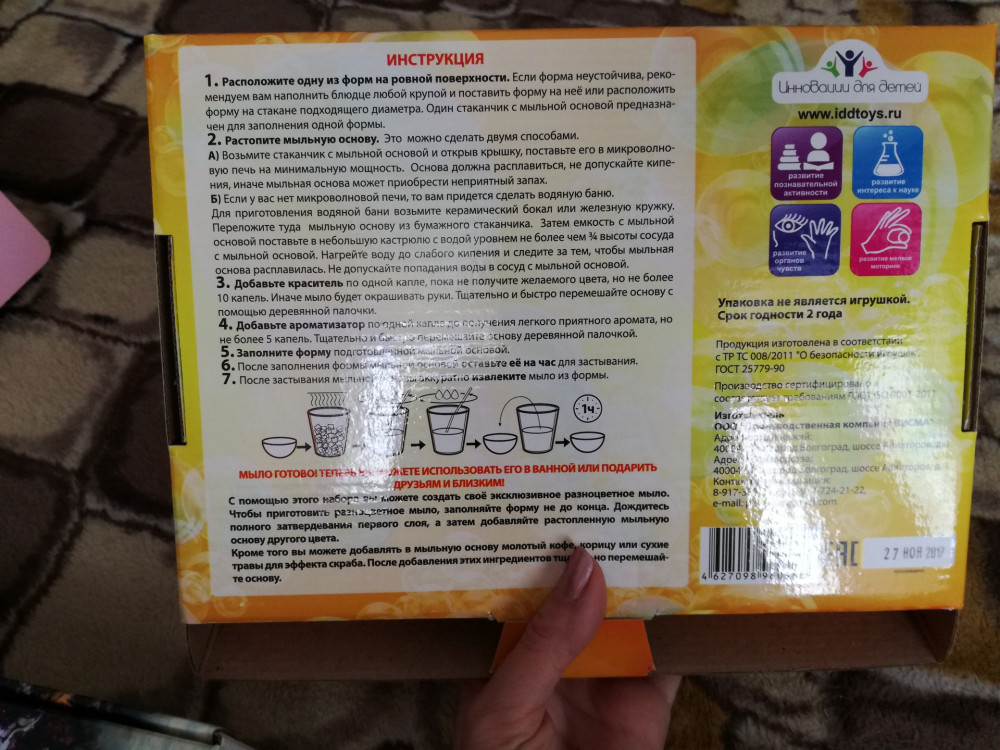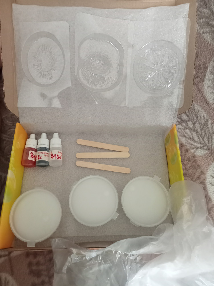 У нас не получилось мыло. Из двух способов приготовления выбрали второй - на водяной бане, поскольку микроволновкой не пользуемся. В итоге, мыльная основа снизу таяла, сверху застывала, и мы никак не могли добиться однородной массы. Мыло пошло хлопьями оттого, что передержали(( В остальном, набор интересный, инструкции понятны.