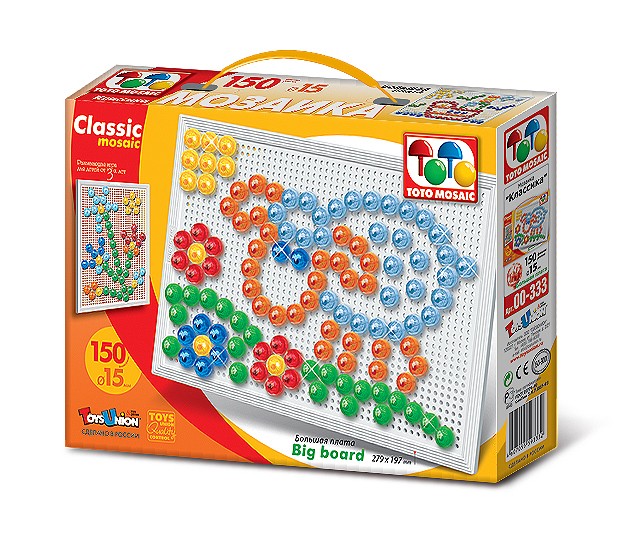 Мозаика хорошего качества. Плата большая, без запаха. Ребенку 2 года очень нравится. Единственный минус вместо заявленных 150 фишек положили 133. Но и на коробке маленьким шрифтом написано, что фишек около 150.