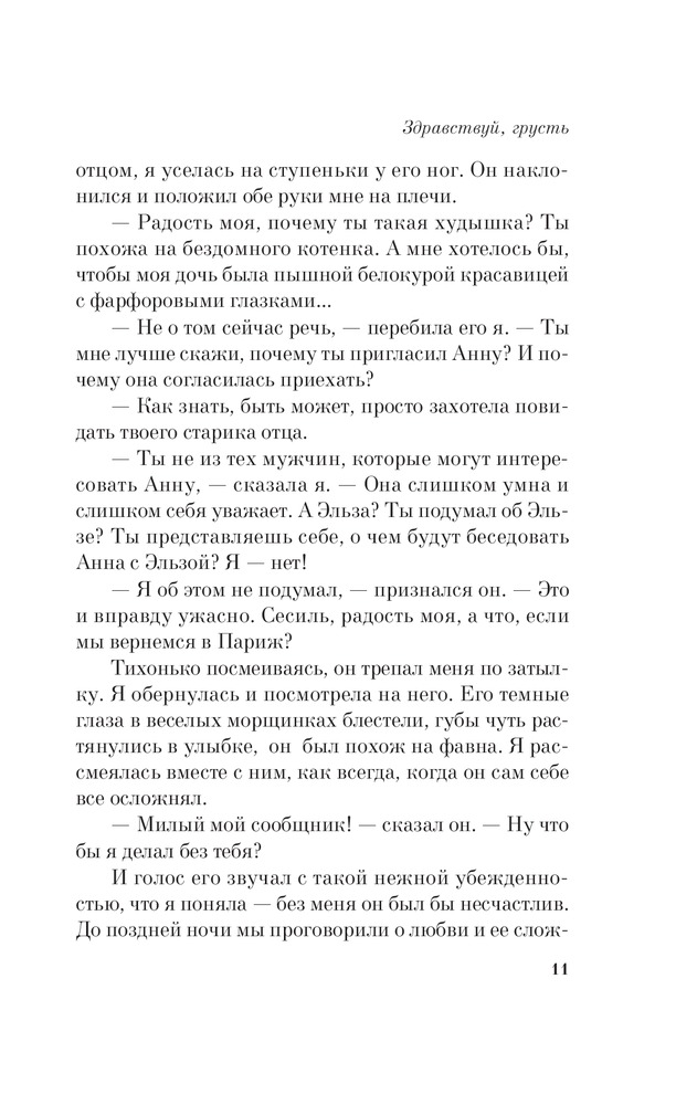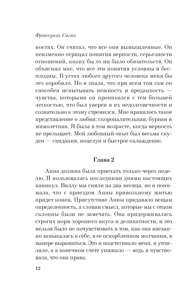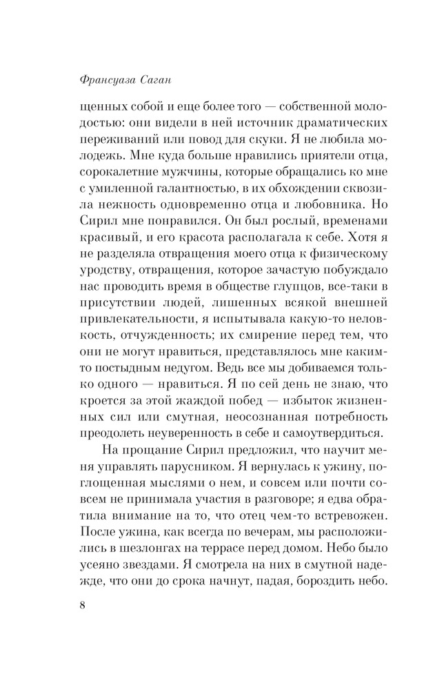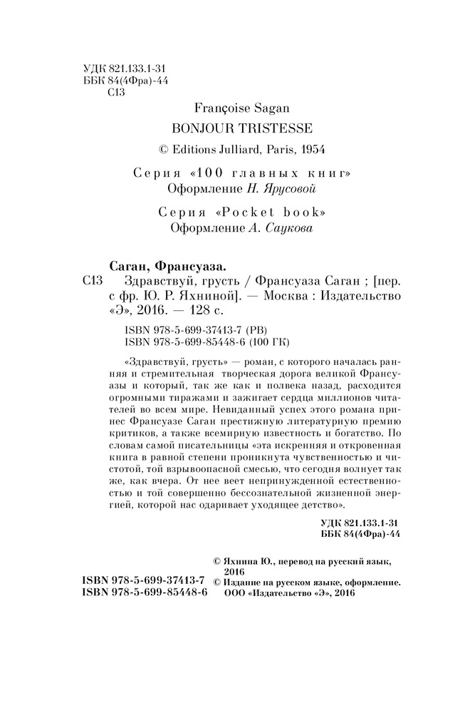 Здравствуй, грустьВ данный момент этот товар отсутствует в продаже. Возможно, у нас найдется аналогичный или похожий товар здесь. Серия: 100 главных книг (обложка) «Здравствуй, грусть» — роман, с которого началась ранняя и стремительная творческая дорога великой Франсуазы и который, так же, как и полвека назад, расходится огромными тиражами и зажигает сердца миллионов читателей во всем мире. Невиданный успех этого романа принес Франсуазе Саган престижную литературную премию Критиков, а также всемирную известность и богатство. По словам самой писательницы «эта искренняя и откровенная книга в равной степени проникнута чувственностью и чистотой, той взрывоопасной смесью, что сегодня волнует так же, как вчера. От нее веет непринужденной естественностью и той совершенно бессознательной жизненной энергией, которой нас одаривает уходящее детство». |