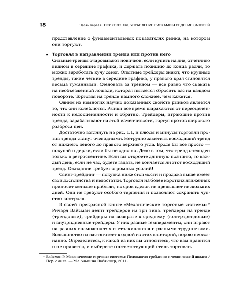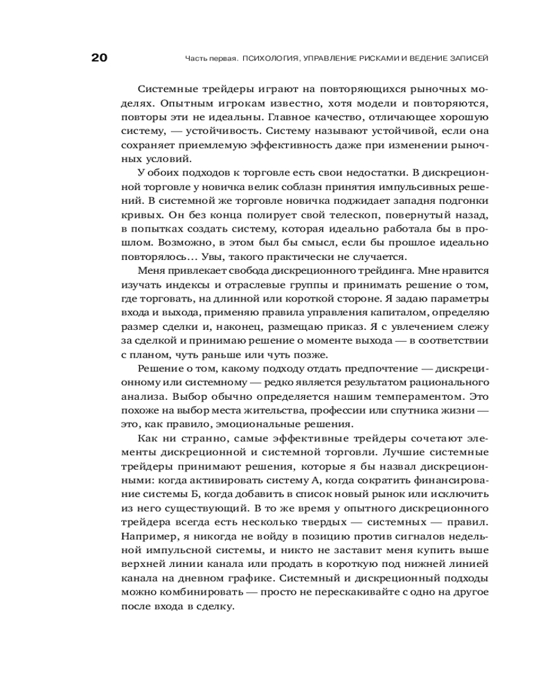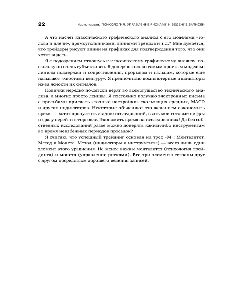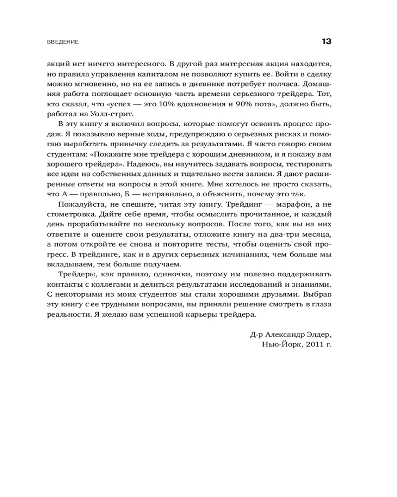 Хочется сказать, что все книги Алекса - это отличное пособие по тому, что надо делать и чего не надо делать. В отличие от многих авторов здесь "не льется вода" и приводится конкретная методика, как можно торговать, как подходить к торговле дисциплинированно и как совладать со своими эмоциями, что не мало важно в трейдинге. Сразу хочется отметить, что если вы не знакомы с ранними книгами автора, то прочтите хотя бы одну из них, т.к. материал подается без подробных описаний предыдущих книг и основная тема отведена игре в шорт, что и правильно. Книга достойна внимания и своей цены. Отдельно хочется отметить, что все приведенные графики в книге цветные, что очень приятно для восприятия и оценки сделок.