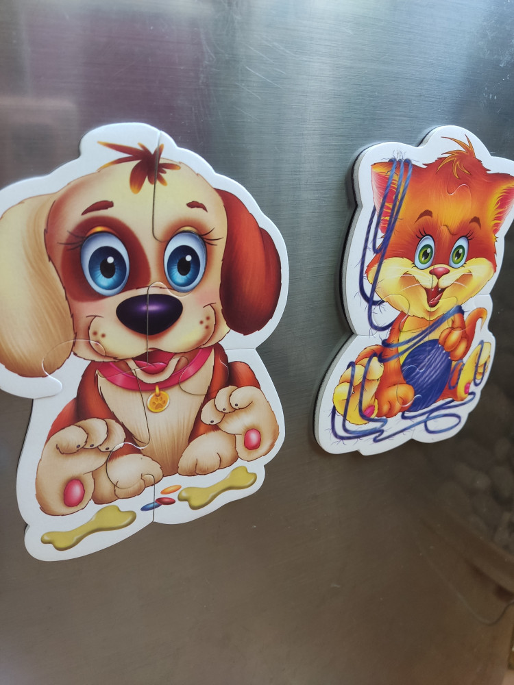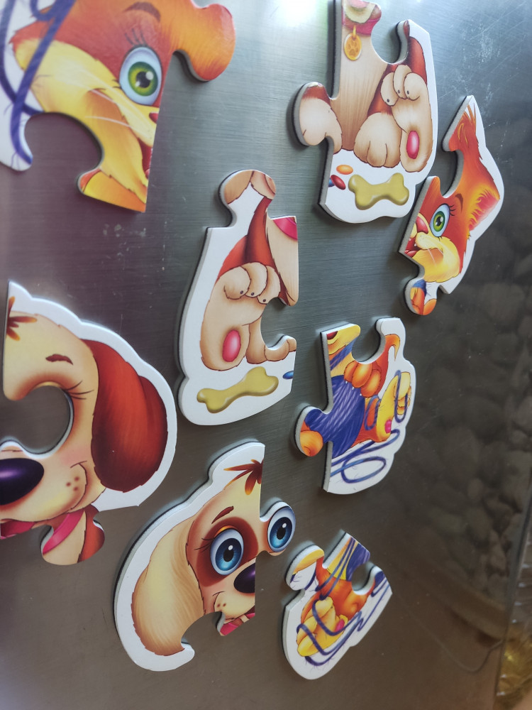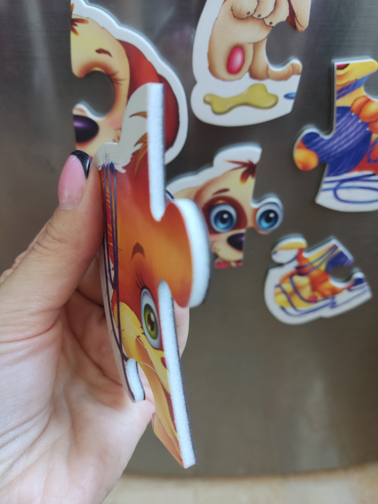 Каждый пазл состоит из трех-пяти частей, поэтому ребенку будет легко с ним справиться. Увлекательное занятие и украшение на холодильник – два в одном.