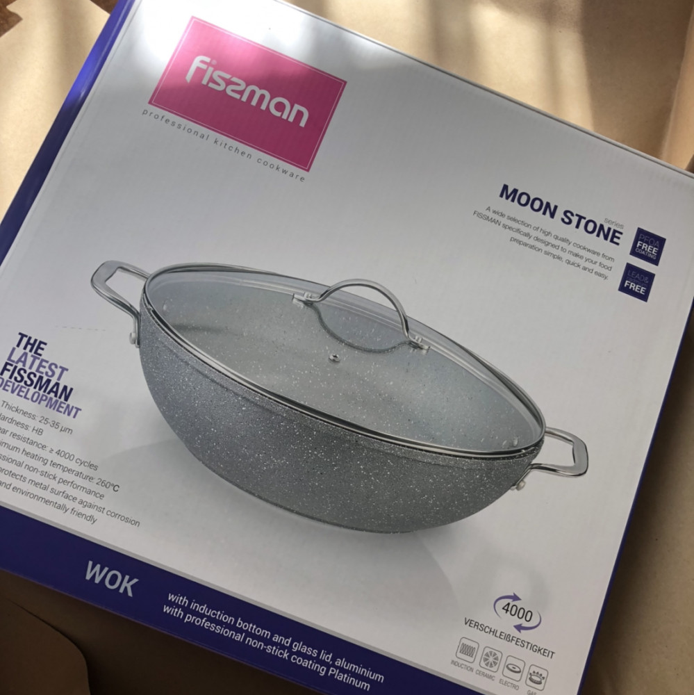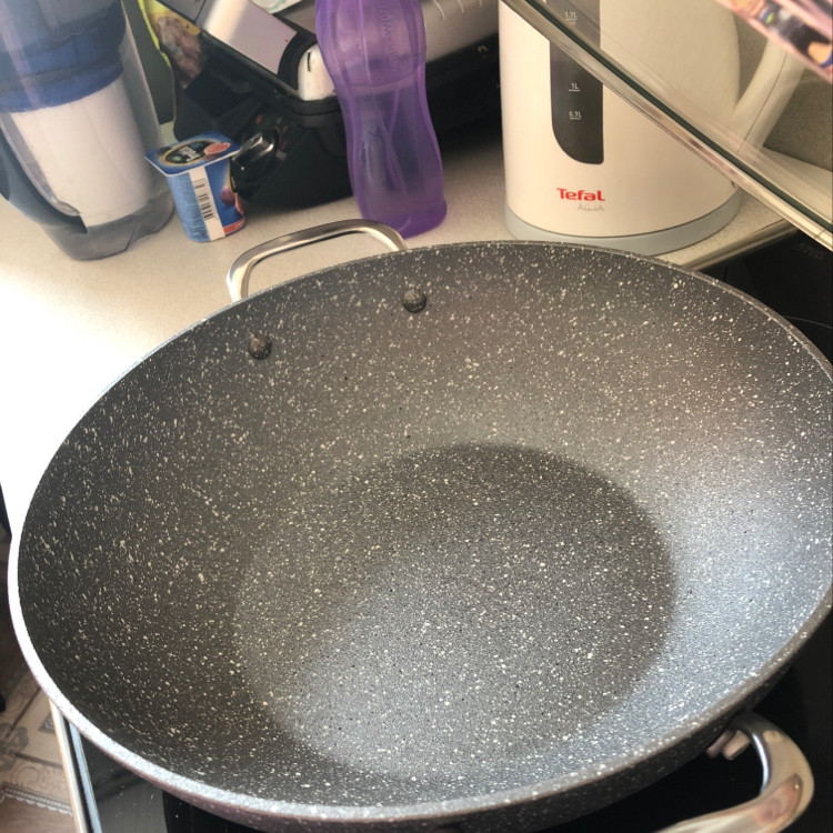 При покупке вок показался на ощупь слишком шероховатый и легкий. Потому что купила сковороду, только другой серии. Но когда готовила, была довольна. Не прилипает, дно удобное и размер взяла на 32 см. Спасибо флипу за скидки.