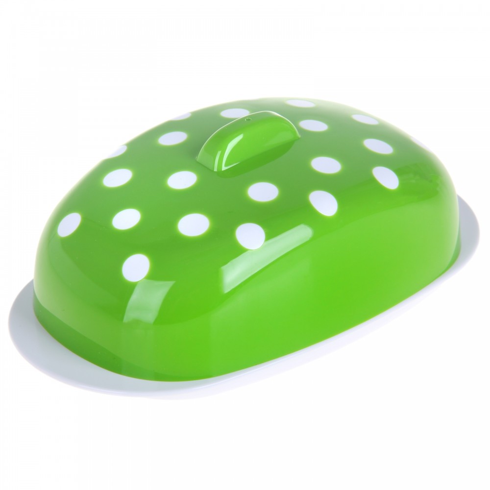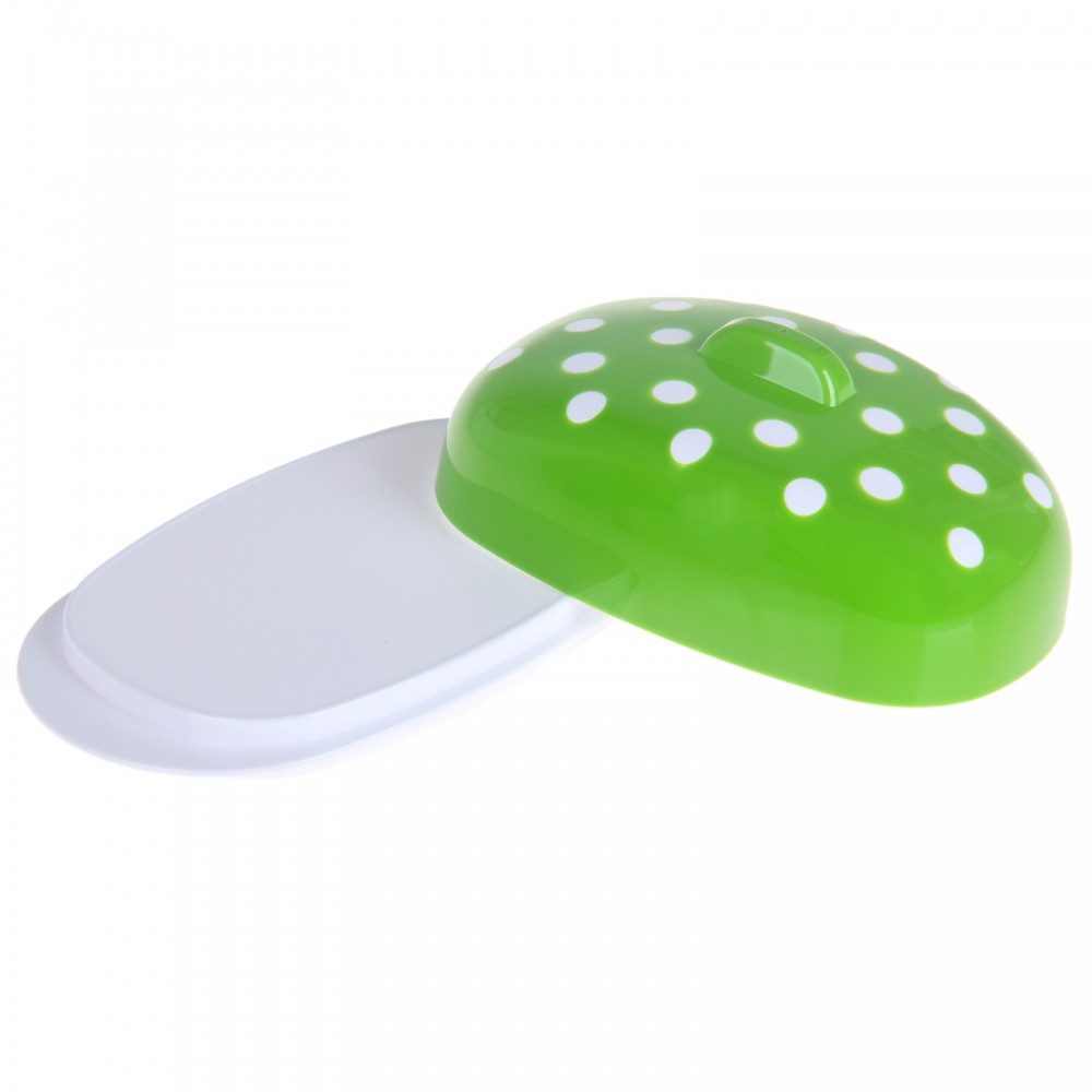 Очень милая, яркая, достаточно вместительная. Стоит отметить, что дно масленки можно использовать с обеих сторон, одна из которых плоская (удобна брать масло), вторая имеет небольшие бортики. Заказывала зеленого цвета, совпадает с цветом на картинке. Пластик хороший, не имеет постороннего запаха.