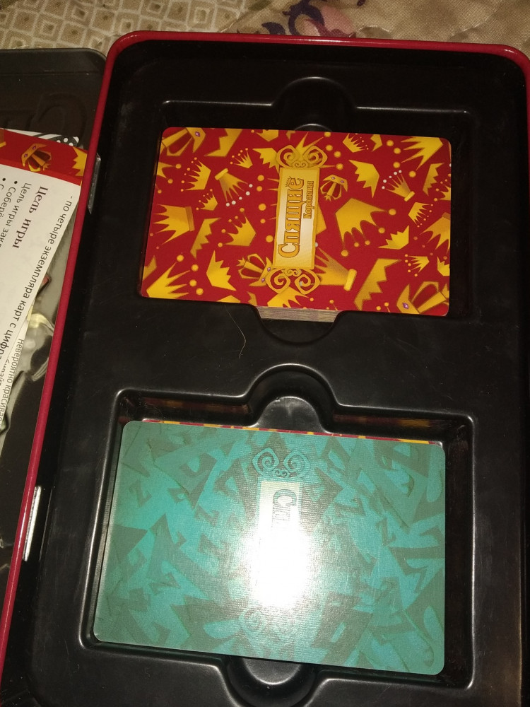 Классная игра для детей или семейного досуга. Играли с таким азартом, что протёрли карты. Нравится коробочка для хранения.