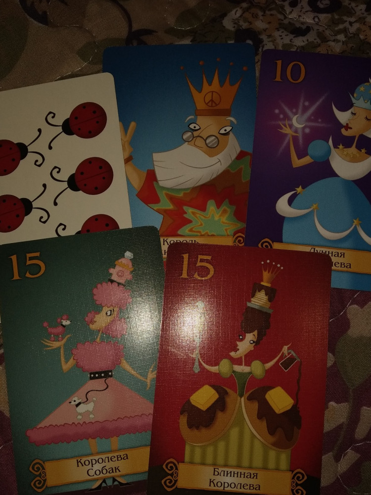 Замечательна коробочка, яркая, нарядная, с объёмным рисунком на ней. Карточки достаточно плотные, расположены внутри коробки в двух отделения. Содержание игры интересное, увлекательное. Не совсем понравилось изображение королев - какие-то они слишком простоватые для королев-то. Но из-за этого снижать оценку не стала.