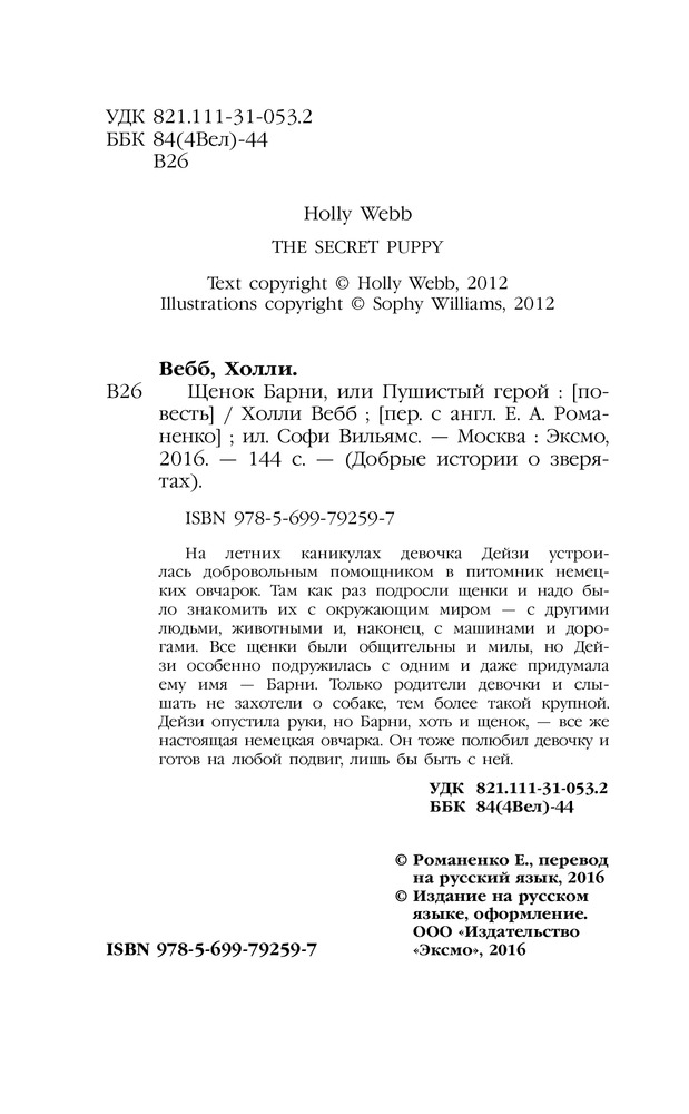 Щенок Барни, или Пушистый геройВ данный момент этот товар отсутствует в продаже. Возможно, у нас найдется аналогичный или похожий товар здесь. Серия: Добрые истории о зверятах. Мировой бестселлер На летних каникулах девочка Дейзи устроилась добровольным помощником в питомник немецких овчарок. Там как раз подросли щенки и надо было знакомить их с окружающим миром — с другими людьми, животными, и, наконец, с машинами и дорогами. Все щенки были общительны и милы, но Дейзи особенно подружилась с одним и даже придумала ему имя — Барни. Только родители девочки и слышать не захотели о собаке, тем более такой крупной. |