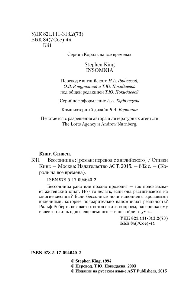 💳 Оплатить за товар можно при получении 🇰🇿 Есть бесплатная доставка по Казахстану 🎁 Копите бонусы с каждой покупки Серия: Король на все времена Бессонница рано или поздно проходит — так подсказывает житейский опыт. Но что делать, если она растягивается на многие месяцы? Если бессонные ночи наполнены кровавыми видениями, которые подозрительно напоминают реальность? Ральф Робертс не знает ответов на эти вопросы, наверняка ему известно лишь одно: еще немного — и он сойдет с ума… |