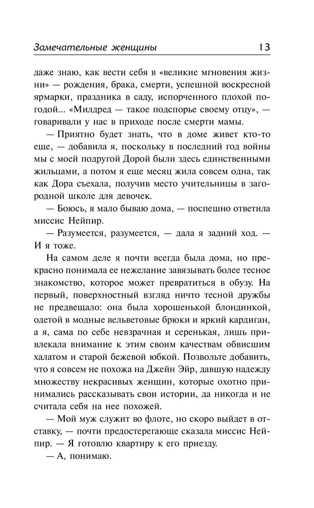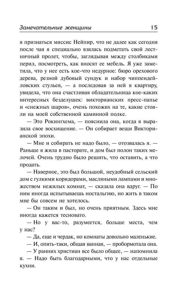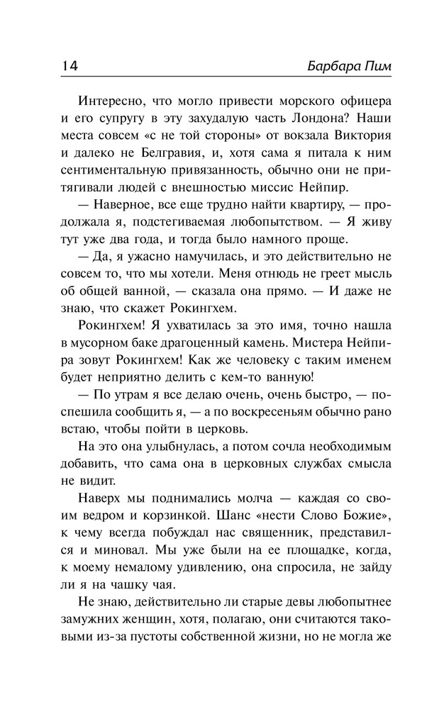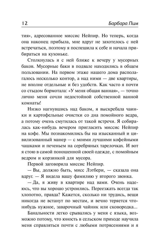 Но вот беда — все чаще Милдред поневоле втягивается в перипетии чужих жизней, особенно в сложные отношения новых эксцентричных соседей Нейпиров. Казалось бы, ей надо просто сохранять строгий нейтралитет. Но язвительный Роки Нейпир, похоже, уже не может обходиться без общества Милдред, да и сама она все реже думает о викарии, которого все прочат ей в мужья, и день за днем ждет на чай блистательного соседа… |