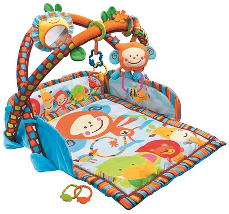 В данный момент этот товар отсутствует в продаже. Возможно, у нас найдется аналогичный или похожий товар здесь. Развивающий коврик - это удивительное путешествие в мир сказочных животных! Он выполнен из мягких, приятных для кожи ребенка цветных тканей. У коврика два положения дуг. Главный персонаж – обезьянка Би-би крепится на мягкие дуги в виде лиан с помощью длинного хвостика. Зеркальце-погремушку в виде цветка, можно подвесить на дугу, и малыш сможет доставать к нему ножками, а также смотреть в него. Дополнительно, на коврик можно расположить с помощью липучек жирафика-шуршалку и пять пластиковых фигурок. Съемные колечки- цепочка разнообразят игру малыша.