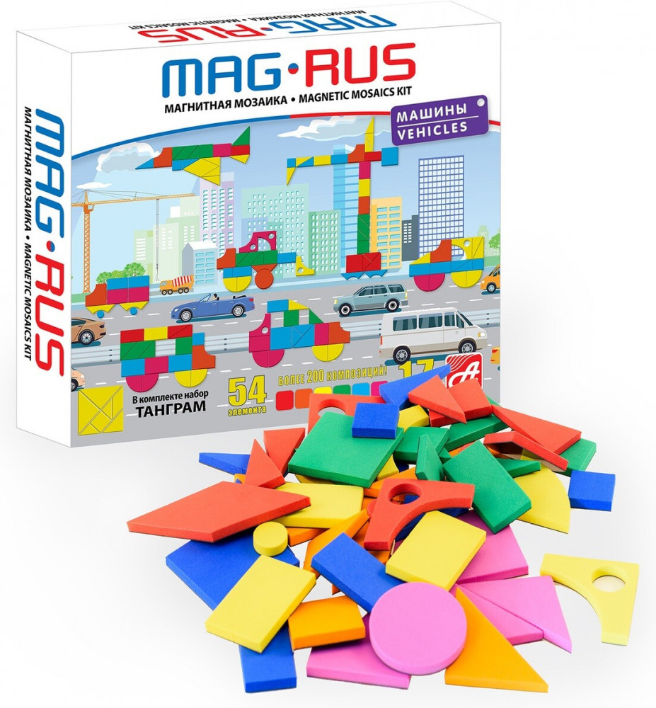 Мозаика Mag-Rus — безопасная магнитная мозаика. Ее крупные детали выполнены из плотного мягкого полимера. Поэтому мозаика подойдет ребенку в любом возрасте. Мозаика универсальна в использовании. Ею можно играть на холодильнике или любой другой гладкой металлической поверхности. Детали прочные, а основа из качественной магнитной ленты, хорошо магнитится и прослужит долго. Удобная прочная упаковка позволит детям и родителям взять мозаику в путешествие или поездку.