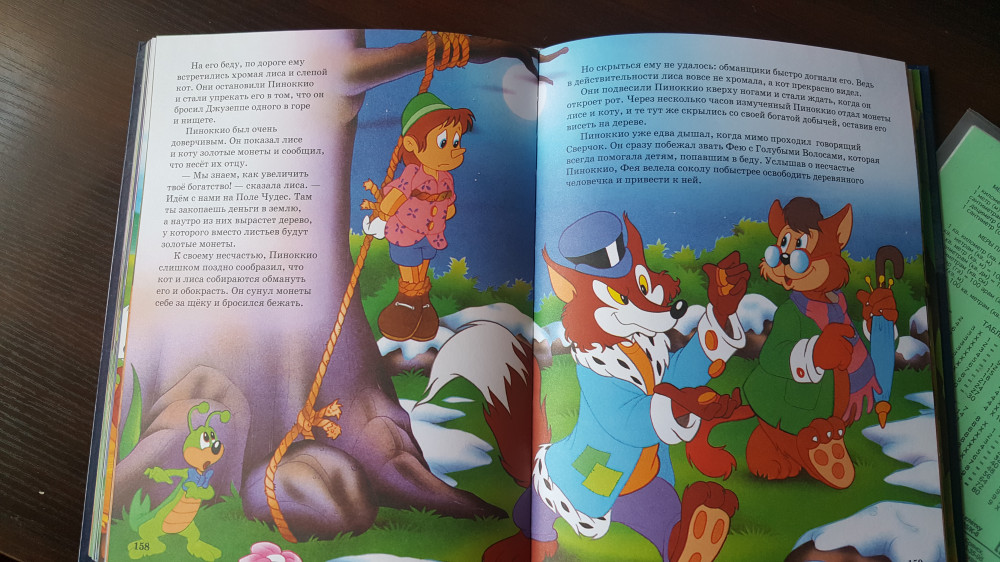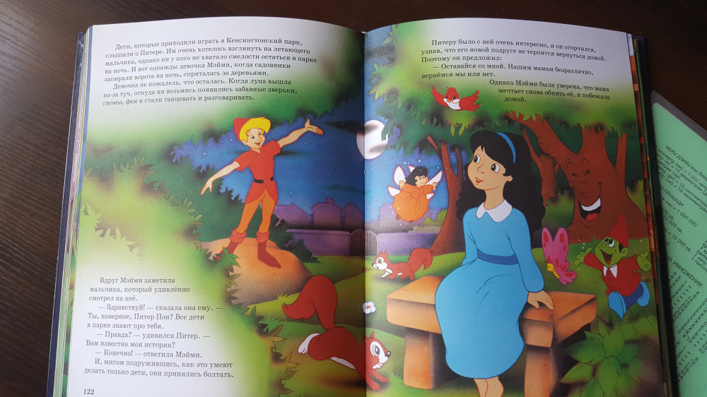 Книга красочная качество отличное, самое интересно сын 9 лет особящка спрашивает а почему питр пэн в красном , а не в зелёном, и почему принцесса Будур , а не Жасмин интересно было такие моменты по вспоминать и давать правильные ответы и ещё сын говорит надо было на обложке написать Дисней 😅😅😅😅 на самом деле рисунки и сказки отличаются от сюжетов из мультфильмов