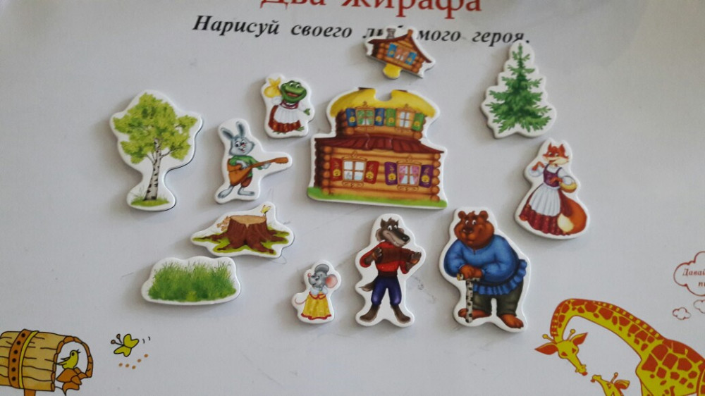 В игру входят персонажи скажки и декорации. Все элементы — мягкие и толстенькие, такими магнитами удобнопользоваться. Также в состав игры входит сказка-сценарий, однако, надеемся, что ребенок придумает много своих собственных сказок вместе с этой игрой!