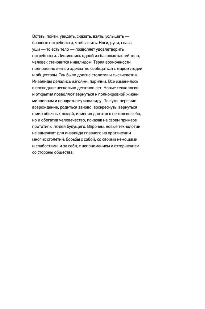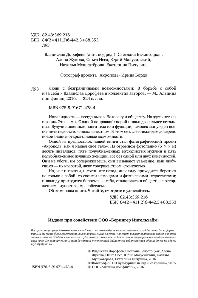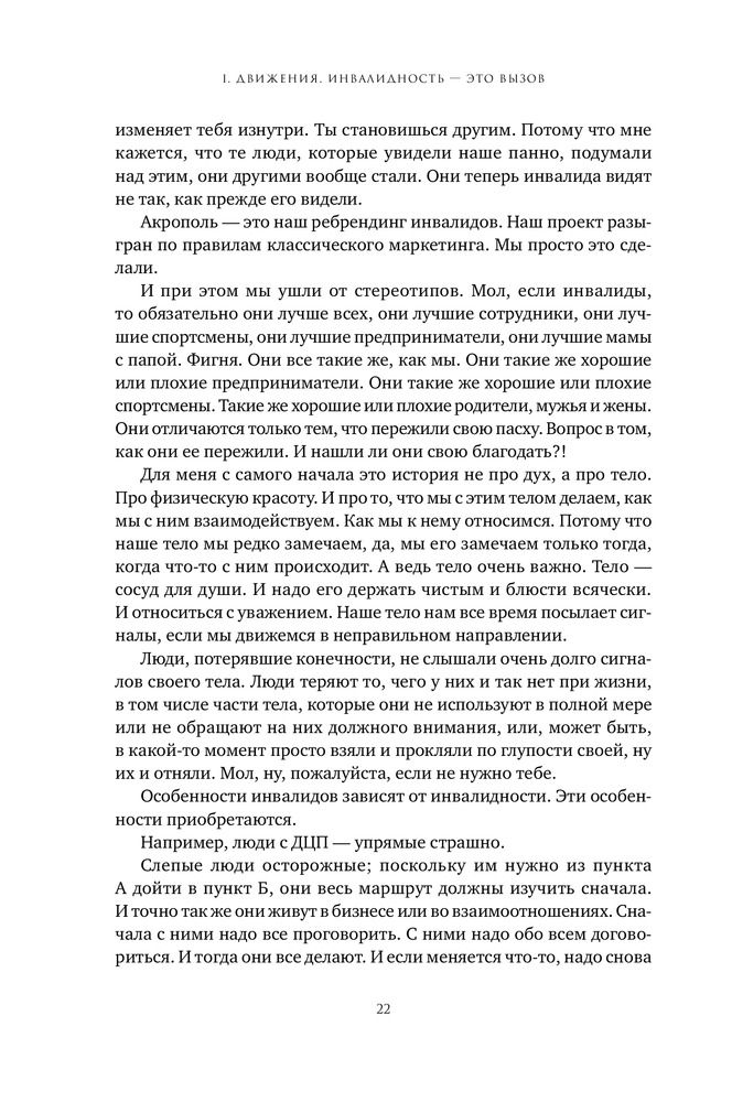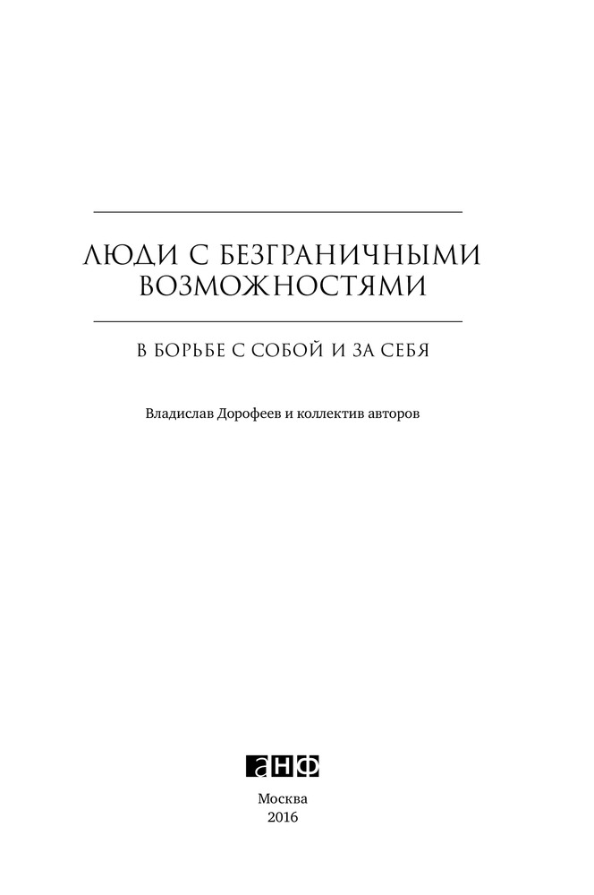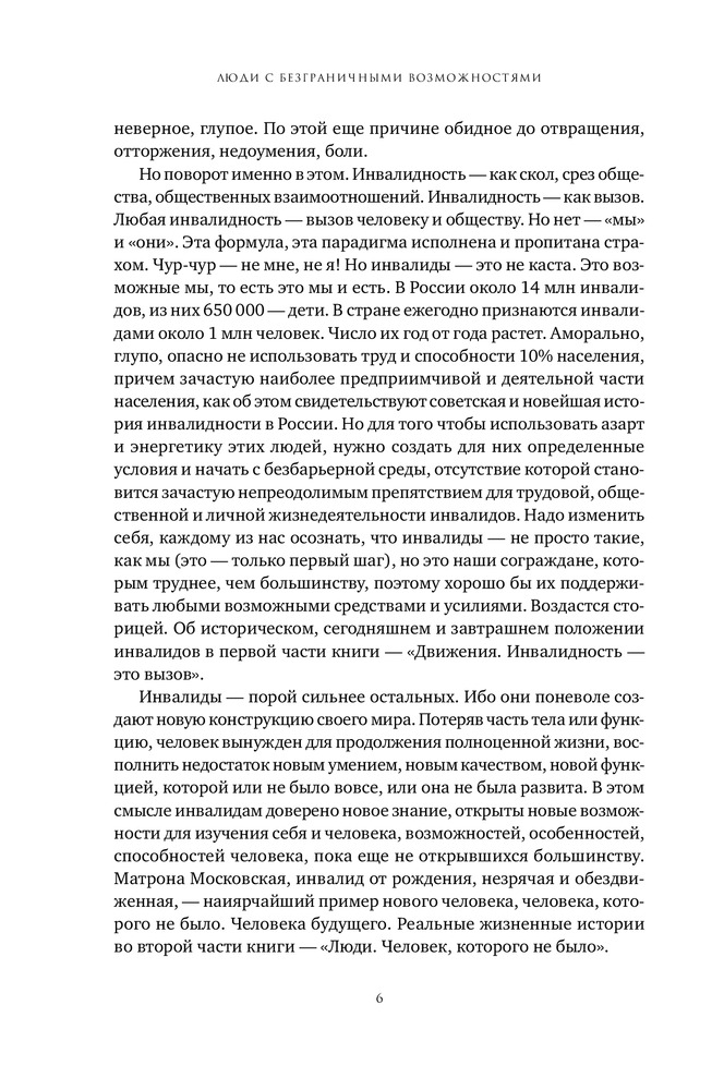 Люди с безграничными возможностями. В борьбе с собой и за себяВ данный момент этот товар отсутствует в продаже. Возможно, у нас найдется аналогичный или похожий товар здесь. Инвалидность — всегда вызов. Человеку и обществу. Но здесь нет «я» и «они». Это — мы. С одной поправкой: порой инвалиды сильнее остальных. Будучи лишенным части тела или функции, человек вынужден восполнить недостаток иным качеством. В этом смысле инвалидам доверено новое знание, открыты новые возможности. |