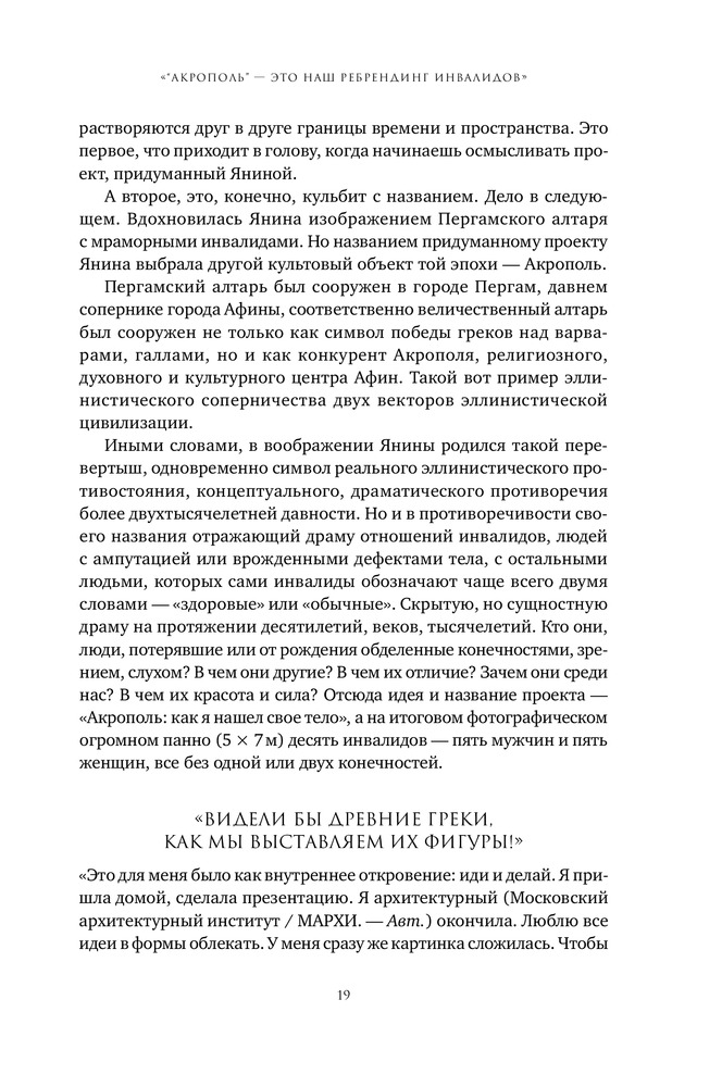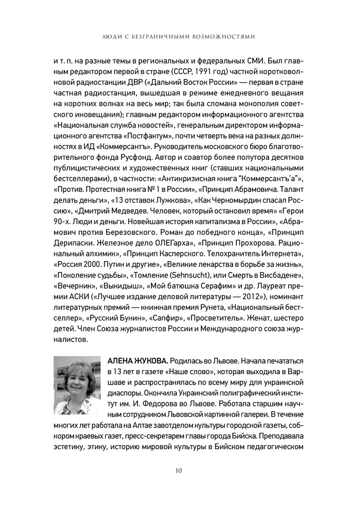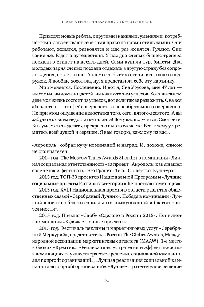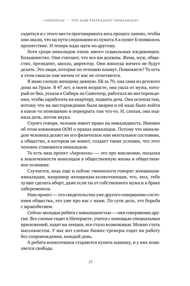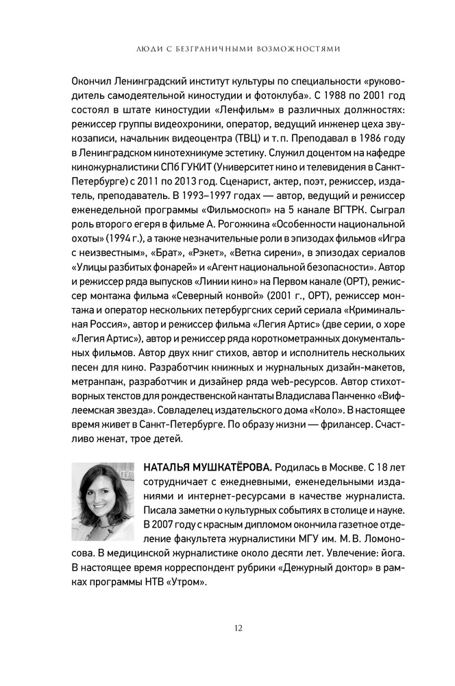 Люди с безграничными возможностями. В борьбе с собой и за себяВ данный момент этот товар отсутствует в продаже. Возможно, у нас найдется аналогичный или похожий товар здесь. Инвалидность — всегда вызов. Человеку и обществу. Но здесь нет «я» и «они». Это — мы. С одной поправкой: порой инвалиды сильнее остальных. Будучи лишенным части тела или функции, человек вынужден восполнить недостаток иным качеством. В этом смысле инвалидам доверено новое знание, открыты новые возможности. |