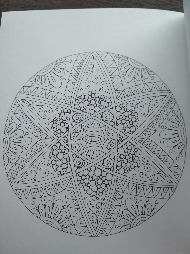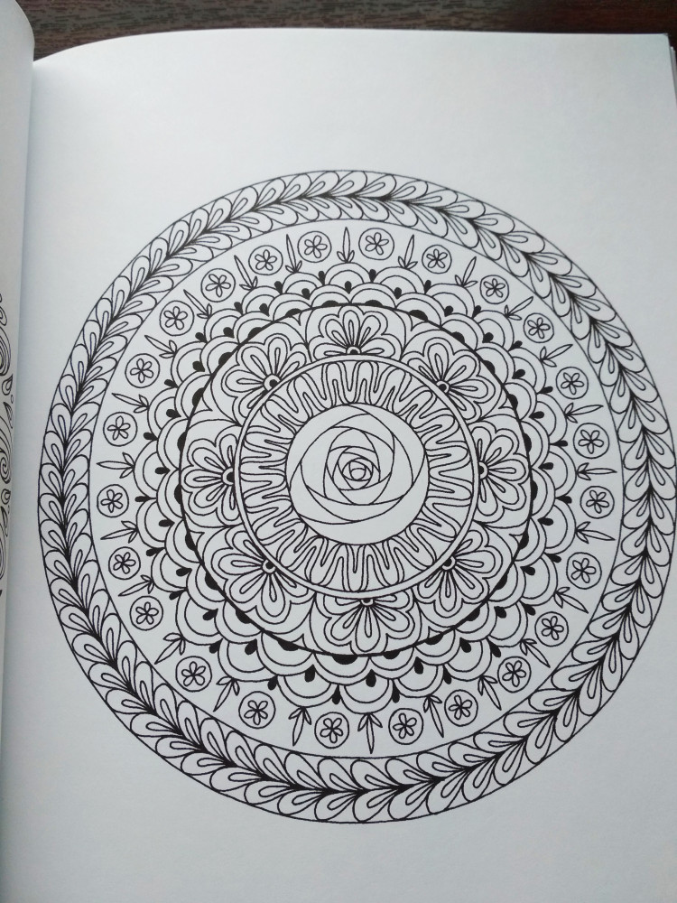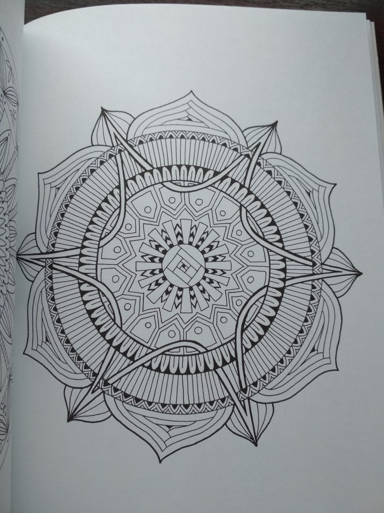 Мандалы интересные, прорисовка чёткая, нет нагромождения чёрного цвета. Бумага белая, плотная, выдерживает капиллярные ручки и фломастеры. На склейке, не прошита.