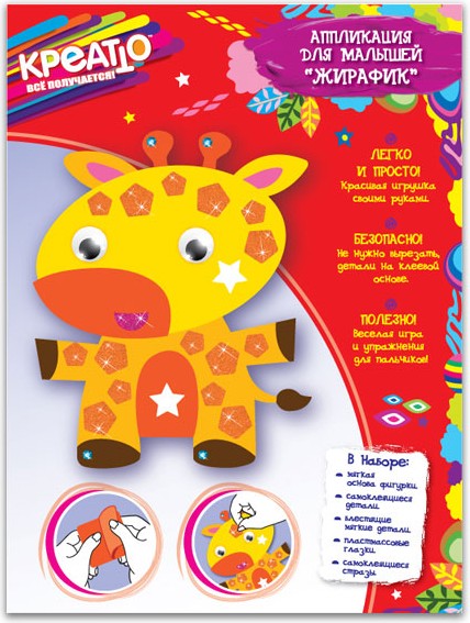 Креатто Объемная аппликация для малышей «Жирафик»В данный момент этот товар отсутствует в продаже. Возможно, у нас найдется аналогичный или похожий товар здесь. Набор для создания объемной аппликации включает в себя разноцветные мягкие элементы, которые нужно наклеить на цветную основу, после чего получится красочная объемная картинка. Такая яркая картинка может украсить детскую комнату или подарена родственникам. В наборе есть все необходимые элементы, которые могут потребоваться во время работы над поделкой, в том числе и объемные глазки, которые добавят живости картинке. Детали выполнены и современного высокотехнологичного материала, он легок и приятен на ощупь, они заранее вырезаны и ребенку не понадобятся ножницы. Мягкие элементы очень легко можно приклеить на картонное основание при помощи липкой основы, которая заранее нанесена на детали. Перед приклеиванием защитную ленту нужно снять и слой за слоем создать поделку. |