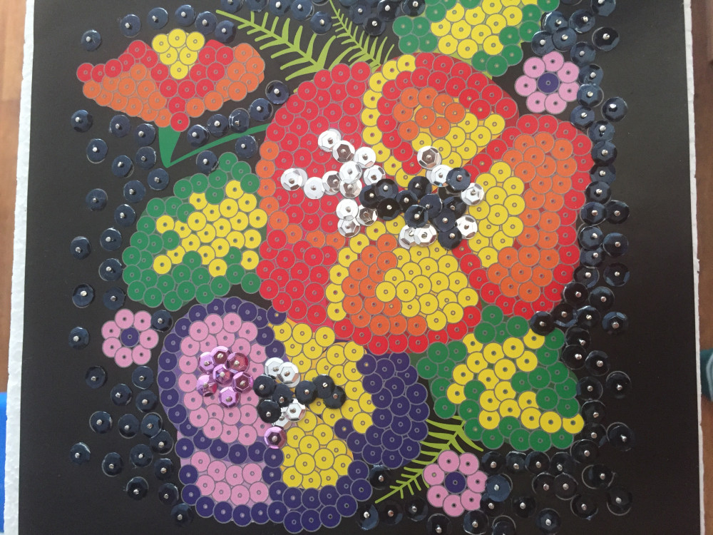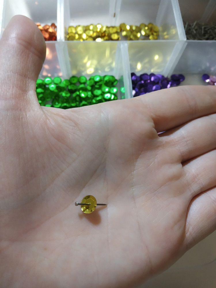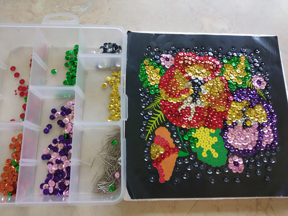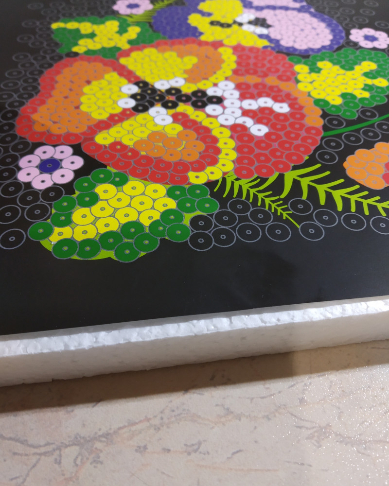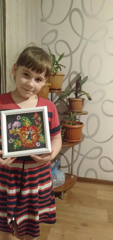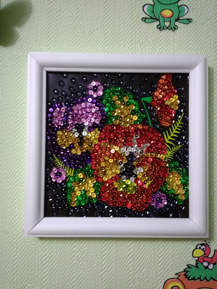 Доче очень понравилось! Крепить пайетки пинами к пенопласту. Получилось очень красиво. Картина переливается, яркая. Заказали еще две картины из этой серии.