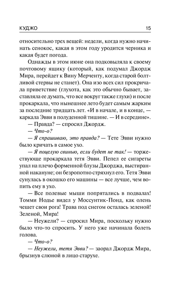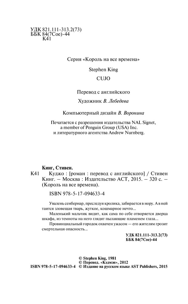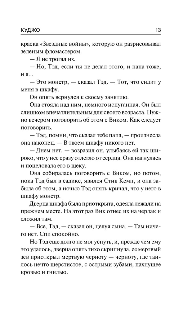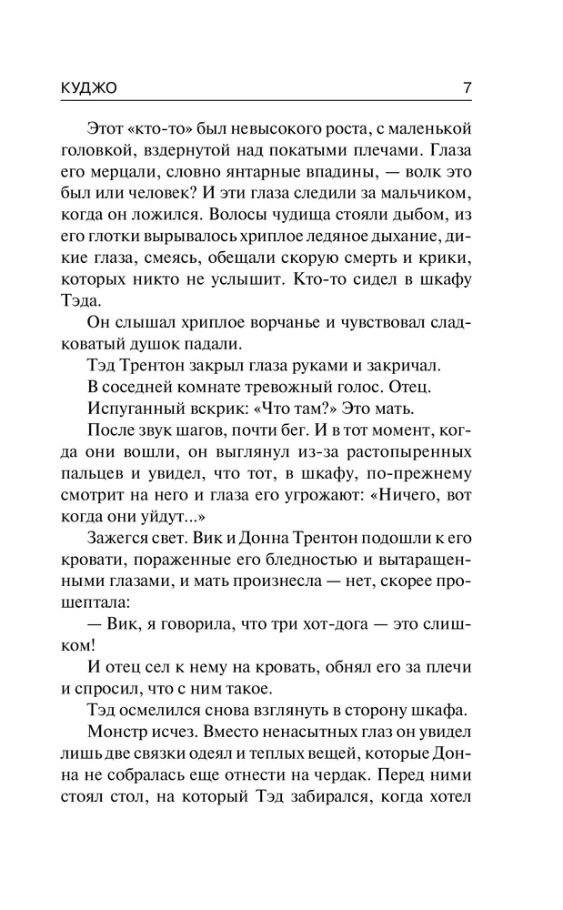 Стивена Кинга я люблю, хотя и не всё, конечно, и вот "Куджо" как раз из того разряда, что мне не "полюбилось". Уже почти с самого начала было ясно, что случится в конце; какого-то жуткого накала страстей или мистики тут, на мой взгляд, вообще нет. Конечно, там вроде бы как и монстра автор время от времени вспоминает, но такое ощущение, как будто Стивена поджимали сроки и он впопыхах книгу дописывал. До середины книги вообще ничего не происходит, потом начинается какое-то действие, но более менее сюжет оживает на последних страницах. В общем, не понравилось. К качеству печати претензий нет - твердый красивый переплет. К магазину тоже, как всегда, никаких претензий.