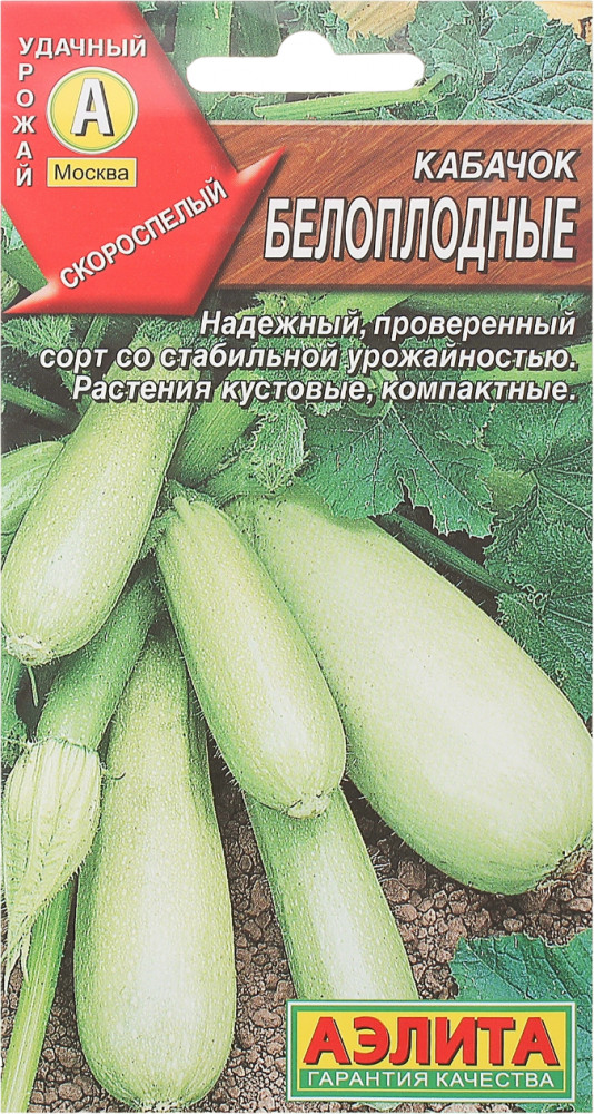 Скороспелый отечественный сорт (от всходов до первого сбора 36-41 день). Растения кустовые, компактные. Плод цилиндрический, гладкий, слаборебристый у основания, массой 0,6-0,9 кг, с тонкой белой корой. Мякоть белая, плотная, нежная, с отлич ными вкусовыми качествами. Товарная урожайность свыше 10 кг/м2. Плоды лежкие, с хорошей транспортабельностью. Устойчив к бактериозу. Кабачок – диетический продукт низкой калорийности, с богатейшим витаминно-минеральным комплексом, весьма полезен для профилактики и лечения избыточного веса, болезней печени, почек, сердечно-сосудистых заболеваний.
