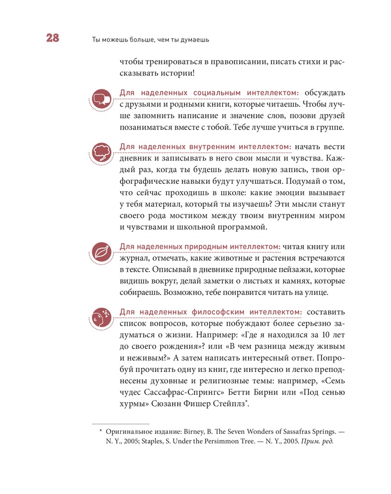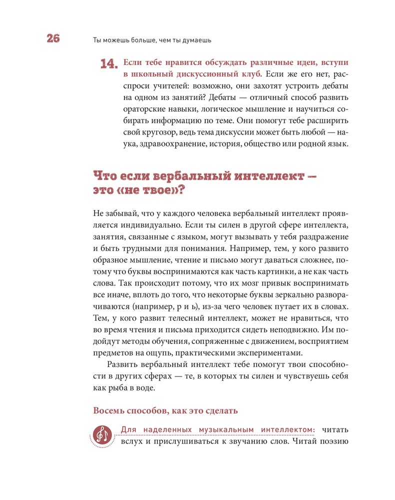 Ты можешь больше, чем ты думаешьВ данный момент этот товар отсутствует в продаже. Возможно, у нас найдется аналогичный или похожий товар здесь. Что на самом деле значит быть умным? Интеллект — это не только хорошие оценки, высокие результаты тестов и умение запоминать. На самом деле, интеллект проявляется во многом — в творчестве, в музыке, в спорте, в умении видеть красоту природы, в эмоциях и способности находить общий язык с окружающими (и даже это еще не все). Прочитав эту книгу, ваш ребенок поймет, что можно быть умным в самых разных областях. |