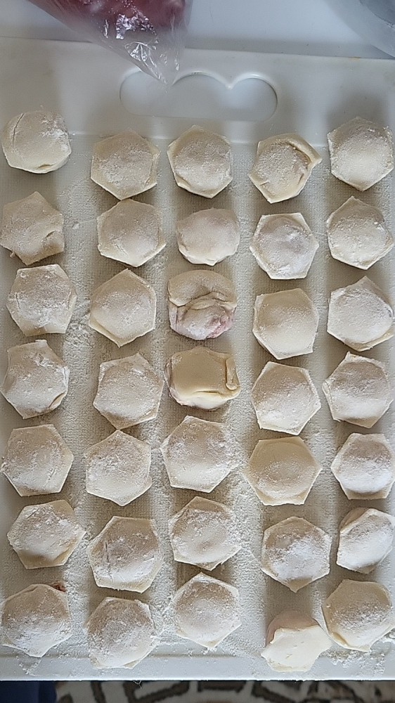 Аккуратные маленькие пельмени получились с первого раза. При варке не расклеялись (это было моим самым страшным опасением 😅). Спасибо за совет: присыпать мукой раскатанное тесто перед тем, как поместить его на пельменницу).