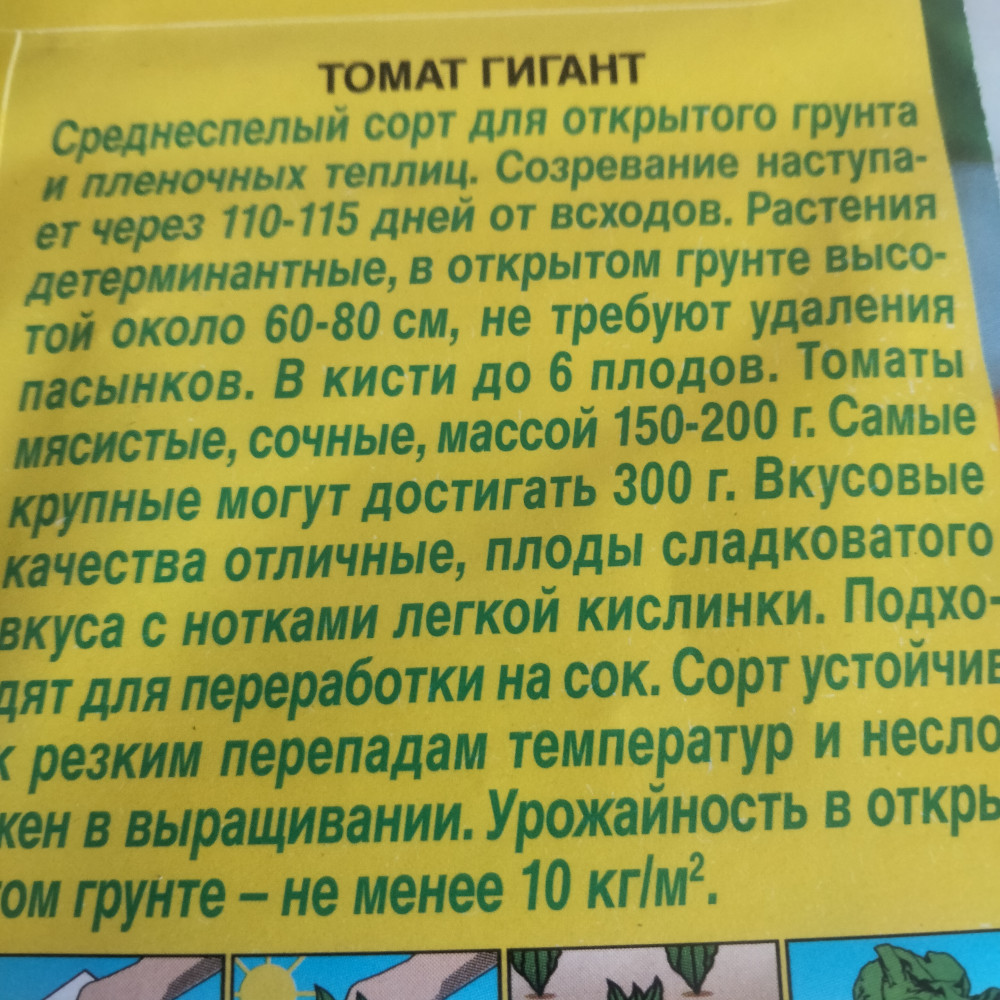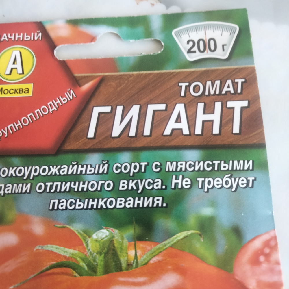 Выписывала семена в 2019 году. Не писала отзыв сразу, так как думала, что перепутала семена, характеристика не соответствовала действительности. В этом году отдельно посеяла и высадила, результат тот же. Помидоры хорошие, не очень большие,средние, крупных не было,в описании масса 200 - 500 г.; рассада крепенькая, но выросла невысокой, не более 60 см., а в описании сказано, что растение сильнорослое (150 см.). Урожайность средняя. Вот я и думаю, что слово "Гигант" надо в кавычки брать, вроде как шутку. Обычные низкорослые томаты, требующие подвязки.