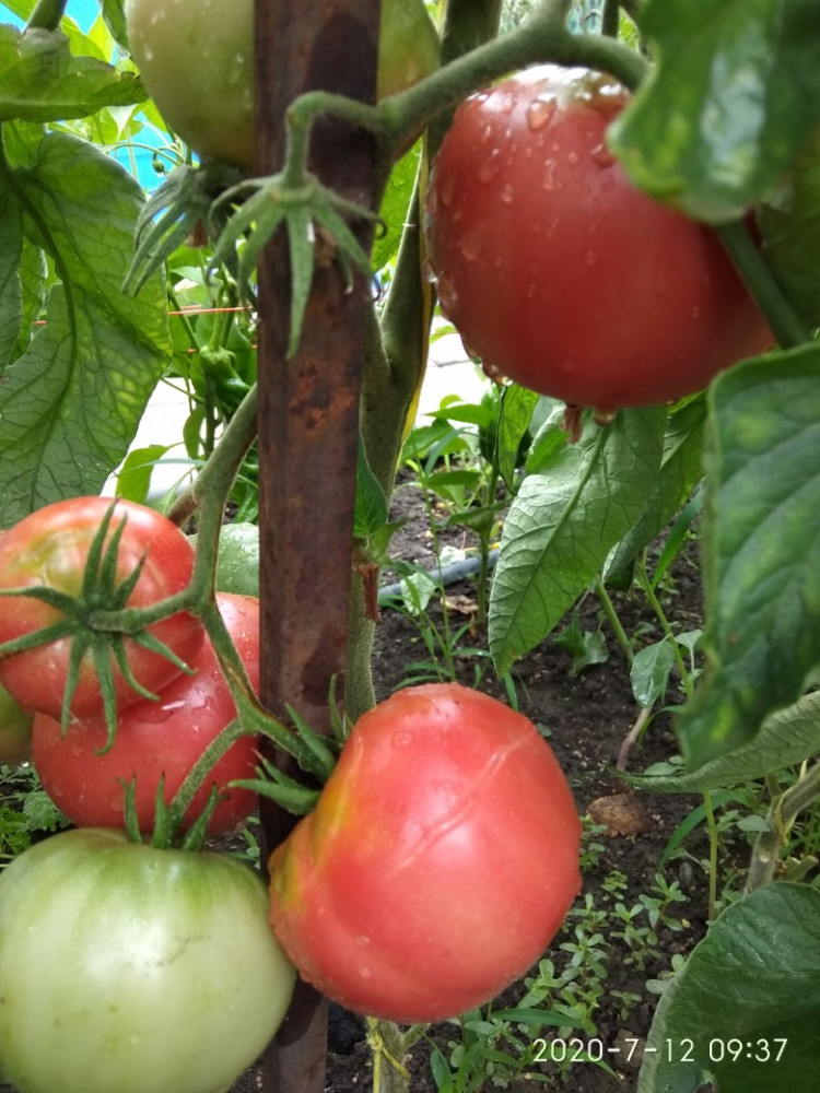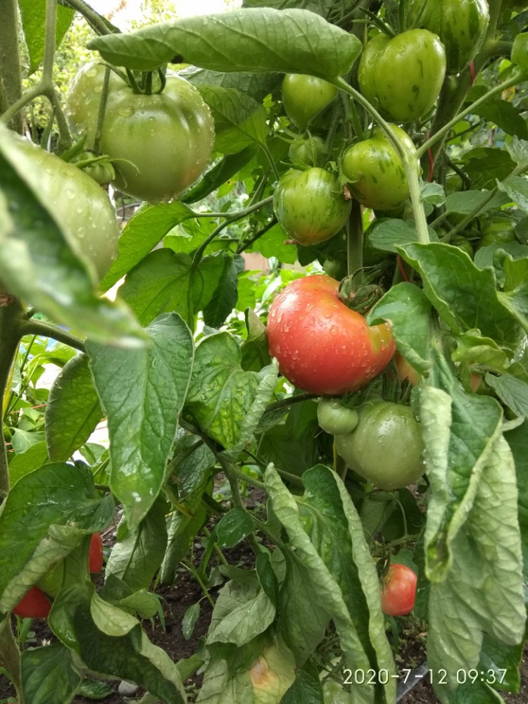 Рассада была очень хорошая, листья не обычные. Выросли небольшие помидоры, с очень тонкой кожицей, положил в ящик, сверху если помидор положишь на них то помидоры лопаются моментально, ранятся. На вкус очень сочные, мясистые, довольно вкусные. На кусту их не много, штук 8-10. Может потому что лето такое. Но сажать больше не буду, уж очень они нежные. Пока донёс до дома, помидоры изранились, только сразу есть нужно. На засолку они тоже не пойдут, те экземпляры размером с большое куриное яйцо как заливаю кипятком сразу весь разваливается помидор. Только на еду пригодны. Завязей очень мало. Некоторые кусты пустые стоят.