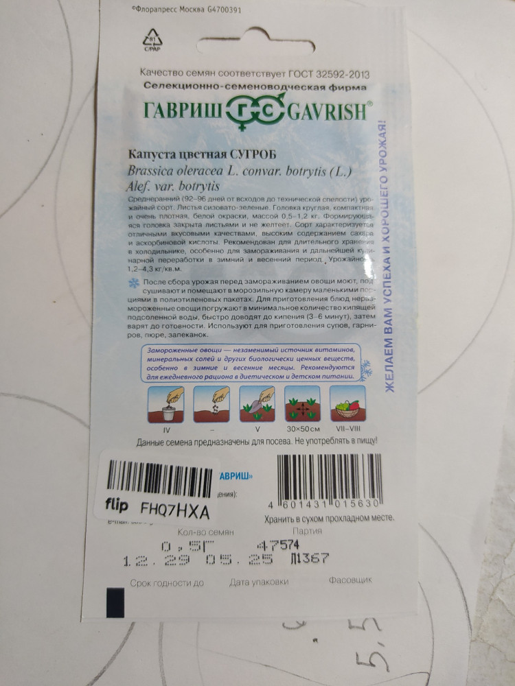 Гавриш Семена. Капуста цветная «Сугроб», 0,5 г-25% +3 высокая всхожесть быстрое прорастание крупные кочаны приятный вкус необычный окрас листьев
