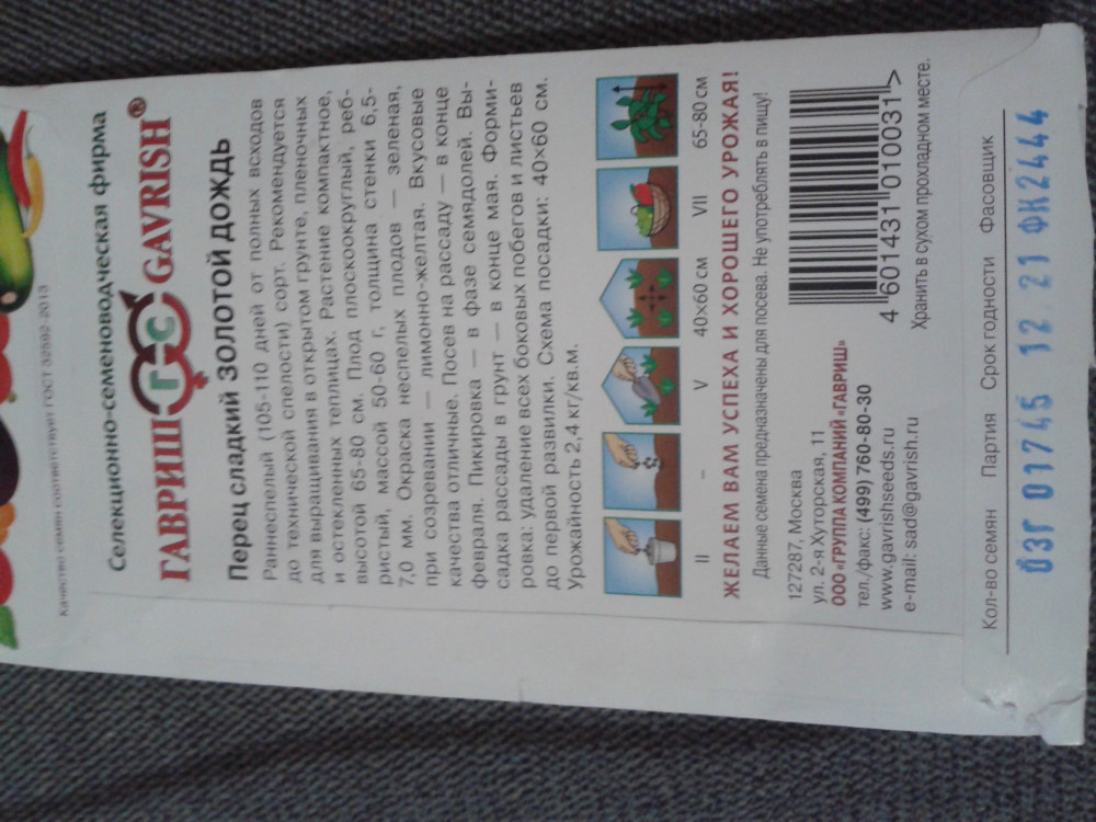 Гавриш Семена. Перец «Золотой дождь», 0,3 гВ данный момент этот товар отсутствует в продаже. Возможно, у нас найдется аналогичный или похожий товар здесь. Серия: Урожай Раннеспелый (116 дней от полных всходов до технической спелости) сорт. Рекомендуется для выращивания в открытом грунте, пленочных и остекленных теплицах. Посев на рассаду в конце февраля. Пикировка в фазе семядолей. Высадка рассады в грунт в конце мая. Формировка: удаление всех боковых побегов и листьев до первой развилки. Растение компактное, индетерминантное, высотой 65–80 см. Плод крупный, плоскоокруглый, ребристый, в технической спелости зеленый, в биологической — |