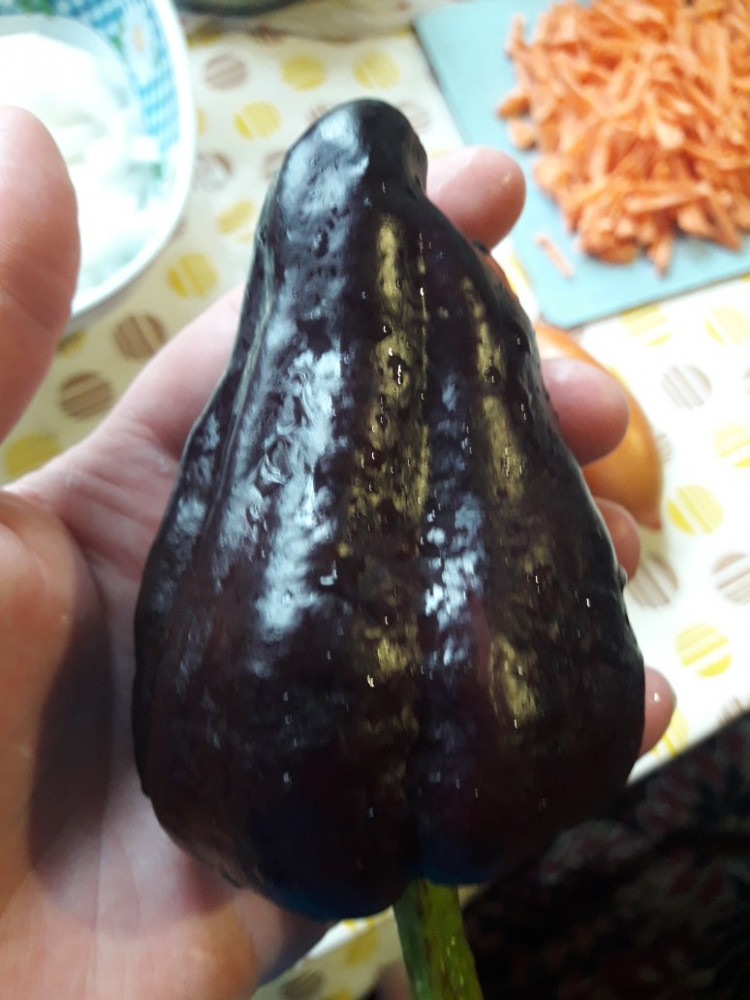 Перец просто супер. Цвет и правда почти черный. У меня он еще не совсем дорос до большого размера, но я не выдержала и сорвала 2 штуки. Внутри мякоть зеленая и если его добавлять в горячие блюда, то при высокой температуре он меняет цвет на зеленый. Мне очень нравится, буду заказывать еще.