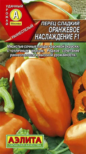 Аэлита Семена. Перец «Оранжевое наслаждение F1», 0,1 гВ данный момент этот товар отсутствует в продаже. Возможно, у нас найдется аналогичный или похожий товар здесь. Серия: Профессиональная серия Раннеспелый, высокоурожайный гибрид отечественной селекции, период от всходов до технической спелости 90-100 дней. Предназначен для выращивания в пленочных укрытиях. Растения средней высоты, полураскидистые, одновременно завязывают 9-14 плодов. Перцы цилин-дрические, гладкие, сильноглянцевые, длиной 12-14 см, Ø 6-7 см, массой 150-180 г, толстостенные (толщина пери-карпия 7-8 мм). Вкус отличный, мякоть сочная, сладкая, мясистая. Рекомендуется для потребления в свежем виде, домашней кулинарии и консервирования. Урожайность 10-11 кг/м2. |