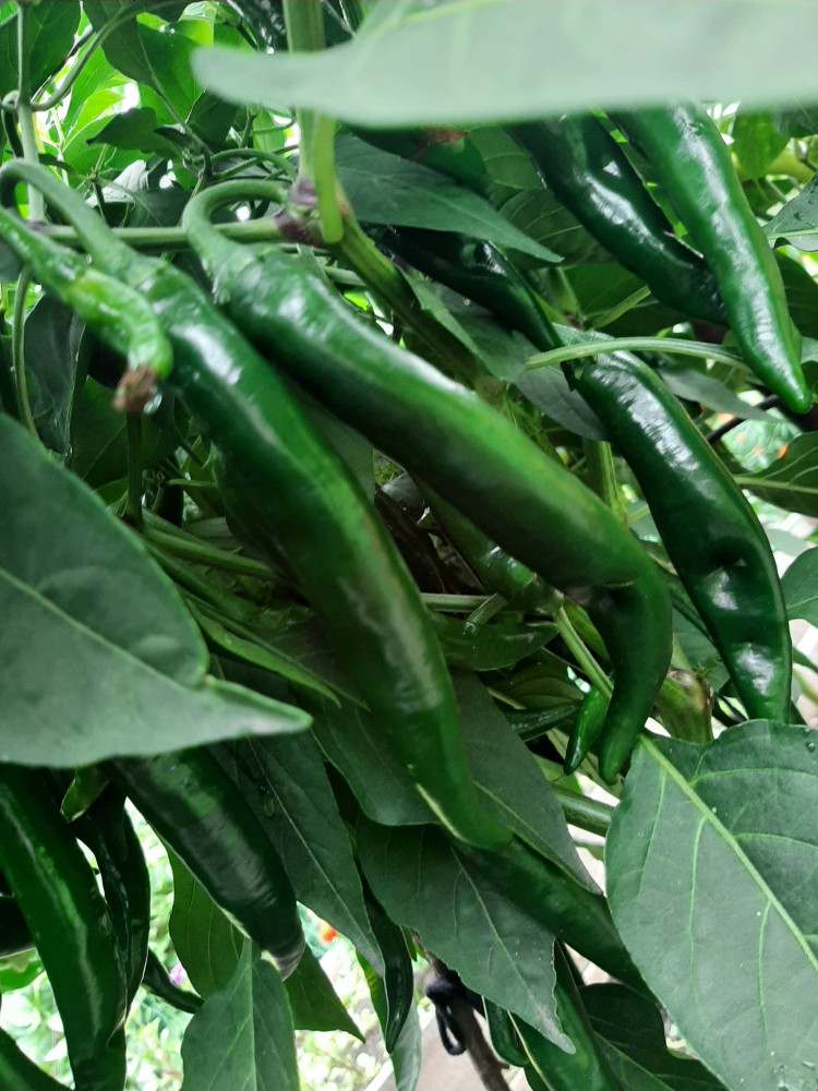 По результату сезона могу сказать, что сорт весьма урожайный. У нас в этом году неимоверно жарко, правда острому перцу повезло, рос в полутени от малины, так что его хоть не попалило, как те же помидоры. Куст крепкий и сильный, в этом году острые перцы занятно сформировали "крону" - таким "зонтиком". Были похожи на эдакую мини зонтичную акацию, видимо из-за лишком сильной инсоляции куст так оформился. Так вот сверху такая "крыша" листвы, а перцы висели снизу сосульками. Когда присматриваешься то видно, что это не сплошная гирлянда, но издалека смотрелось интересно. Сладкие мы на ПМЖ высадили раньше и под дуги+укрывной, а вот острые аж в конце мая и без укрытия. До того стояли уже в 3-х и 3,5 литровых горшках в теплице.
