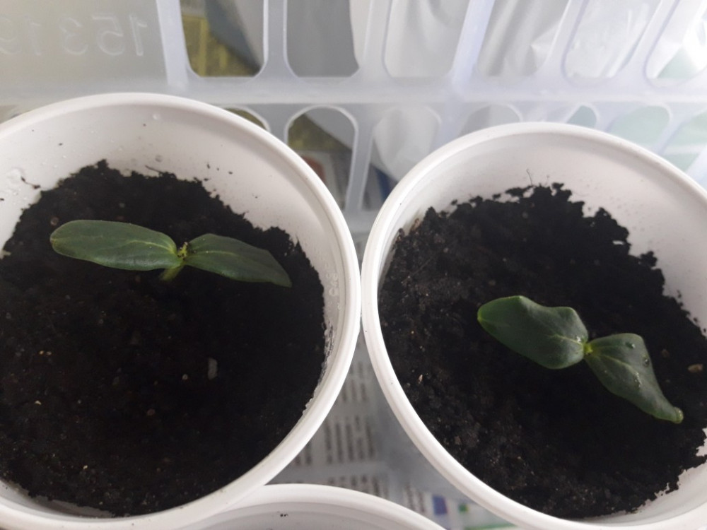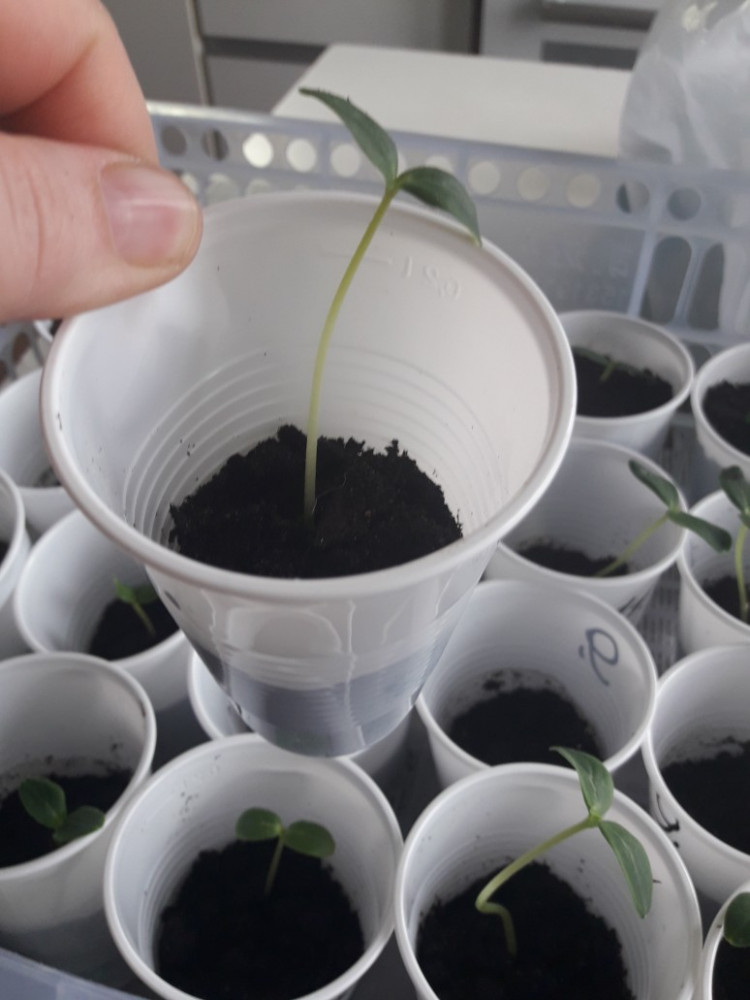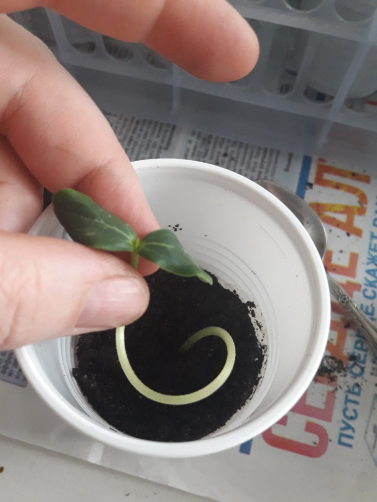 Спасибо, Flip. Благодаря Вам, смогла найти и приобрести все сорта семян, которые искала. Теперь, конкретно о данном сорте. На сегодняшний день, твердая 5 из 5. Проросли самые первые из 14 сортов. Закладывала во влажный спонжик, который предварительно опускала в очень слабый раствор марганцовки, затем слегка отжимала. Далее закладывала туда семена и в коробочку, на сутки, в тепло. На следующие сутки проросли. Уехала на дачу, запланировав взять семена с собой, но, к сожалению, забыла дома. Приехав на 3 день домой, меня ожидала страшная картина. ( фото 1). Этот сорт и еще 2 или 3, проросли через все спонжики корнями. Мало того, вытянулись просто обалдеть, как сильно. Ну что ж, покусав логти, взялась распутывать малышей. Итог: спасла 99 % огурчиков. Все посадила в стаканчики, прикопав по самые листики землей (где то по пол стакана земли). Но через 3 дня, они опять вытянулись в 2 раза (фото 2). Сегодня я их складываю в эти стаканчики колечком (фото 3) и присыпаю землей уже до верха, оставив опять на поверхности только листики (фото4). Надеюсь, больше они так тянуться не будут. Ну, об остальном, отпишусь позже.