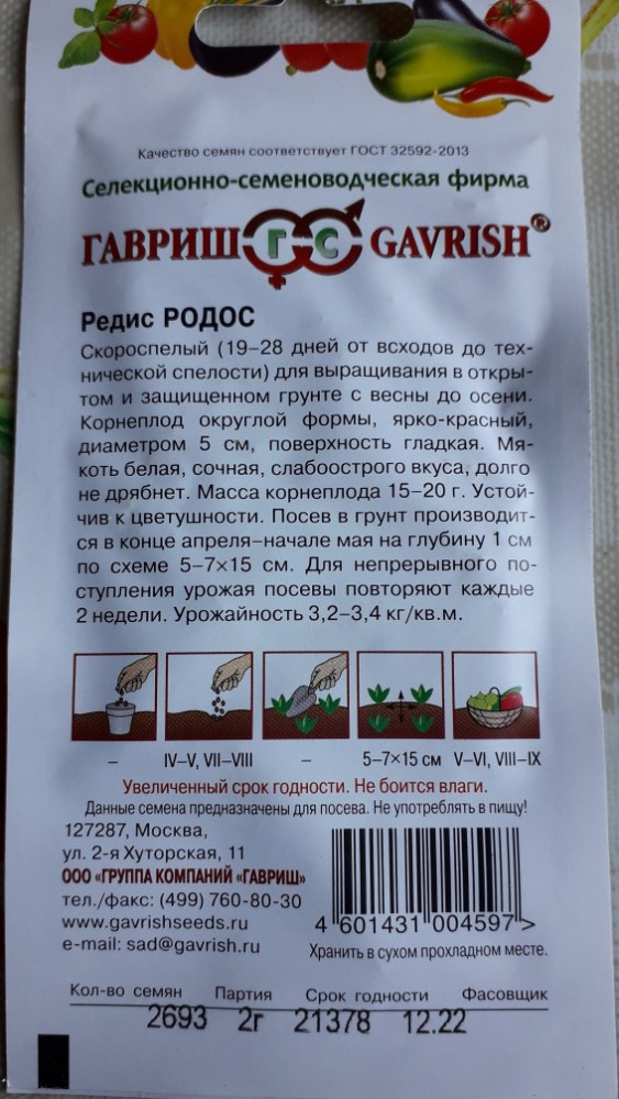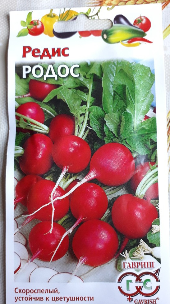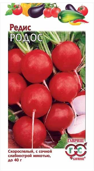 Гавриш Семена. Редис «Родос»,В данный момент этот товар отсутствует в продаже. Возможно, у нас найдется аналогичный или похожий товар здесь. Серия: Редис Скороспелый (19–28 дней от всходов до технической спелости) для выращивания в открытом и защищенном грунте с весны до осени. Корнеплод округлой формы, ярко-красный, диаметром 5 см, поверхность гладкая. Мякоть белая, сочная, слабо-острого вкуса, долго не дрябнет. Масса корнеплода 15–20 г. Устойчив к цветушности. Посев в грунт производится в конце апреля — начале мая на глубину 1 см по схеме 5—7×15 см. Для непрерывного поступления урожая посевы повторяют каждые 2 недели. Урожайность 3,2 — 3,4 кг/м2. |