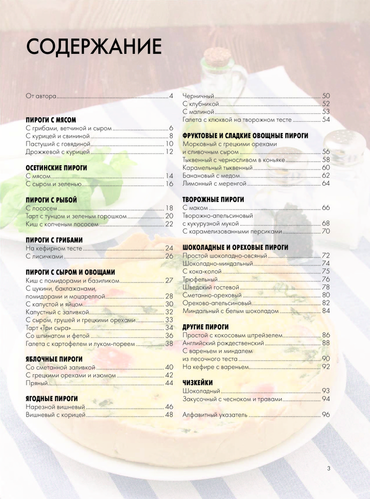 Книга очень большого формата, не толстая. Страницы белые, гладкие. На каждый рецепт есть цветные фото пошаговые и конечного результата выпечки. Шрифт мелковат. В начале книги комментарии от автора по приготовлению разного вида теста. Далее по содержанию: пироги с мясом,осетинские пироги, пироги с рыбой, с грибами, с сыром и овощами, яблочные и ягодные пироги, фруктовые и сладкие овощные пироги, творожные, шоколадные и ореховые, другие пироги (на кефире, с вареньем, со штрейзелем), чизкейки. Продукты для изделий доступны.