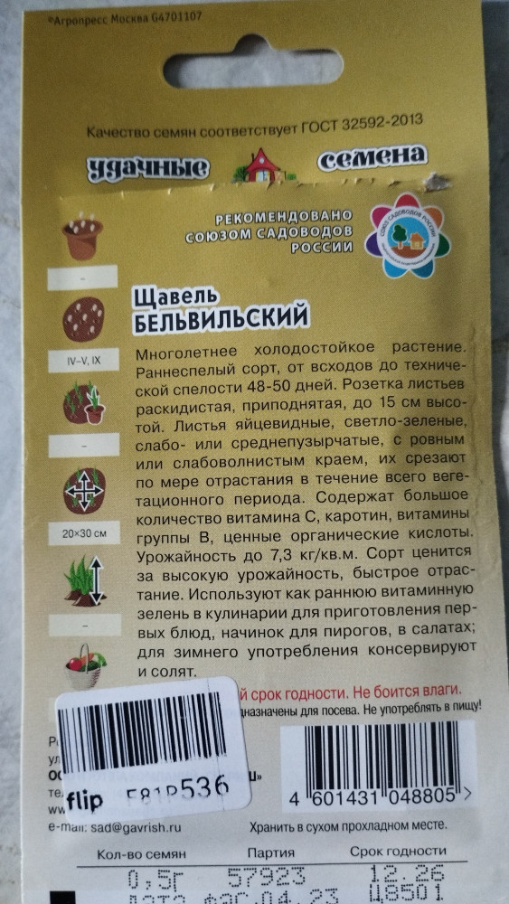 Гавриш Семена. Щавель «Бельвильский», 0,5 г+10 вес взошли упаковка