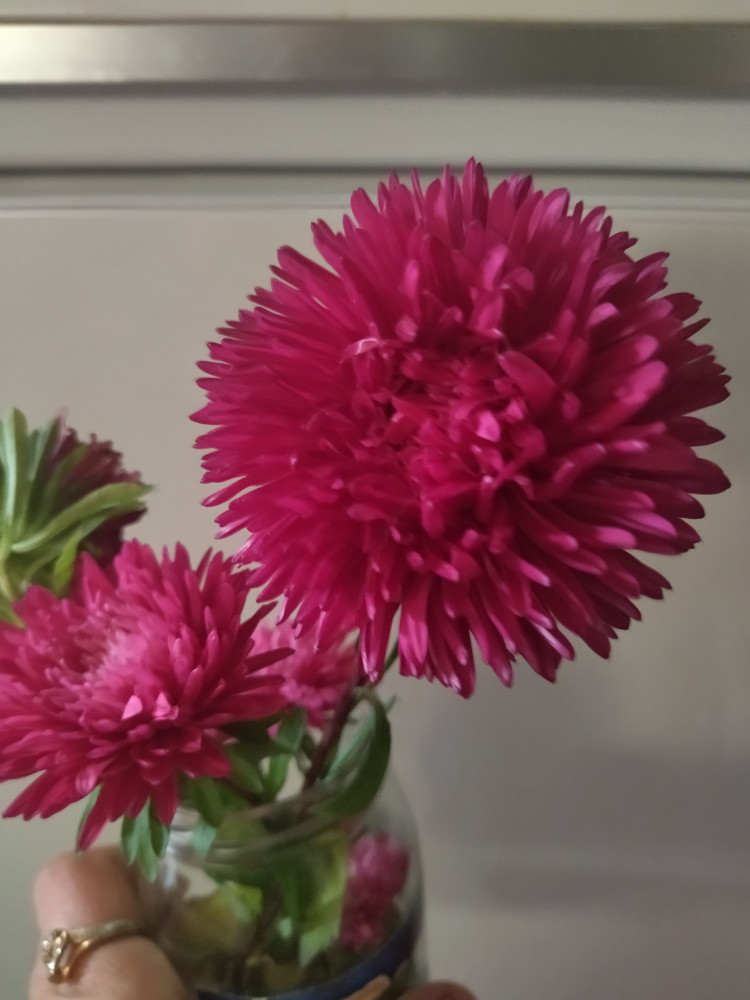 Астра классная!Цвет насыщенный.Не крупная.Я живу на севере Казахстана но всё равно хорошо ростёт.Погода подкачала, осень холодная.Цветет с с середины лета. Собака бегала , сломала,пришлось в баночку ставить.
