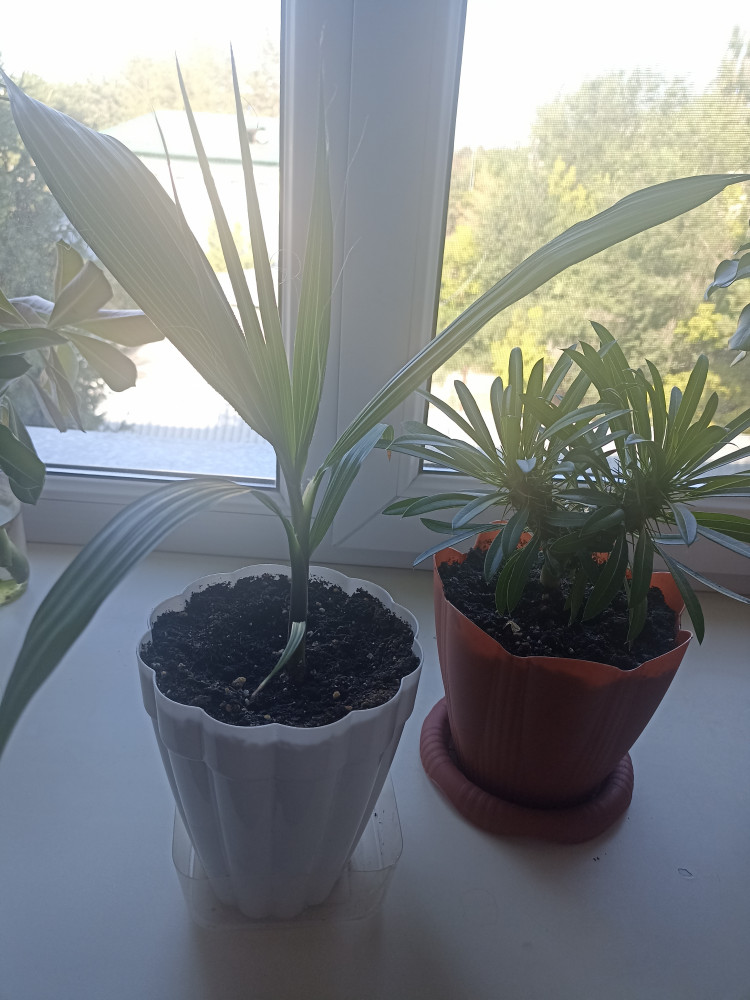 Из трех семечек взошло 2, на фото пальмам 6 месяцев с момента посадки семян. Заметна разница в размере из-за разного времени всхода.