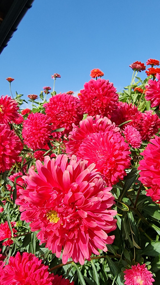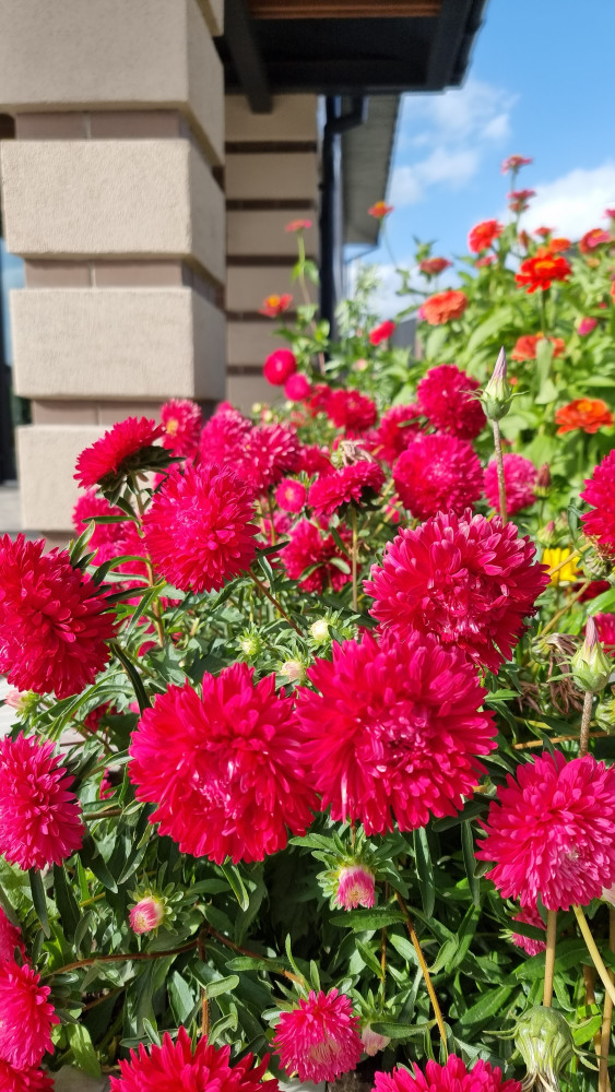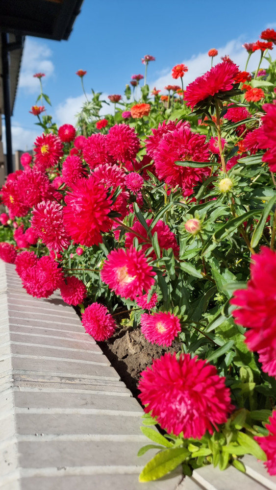 Яркие, махровые, сразу притягивают внимание на себя, выделяются на общей клумбе с астрами разных сортов