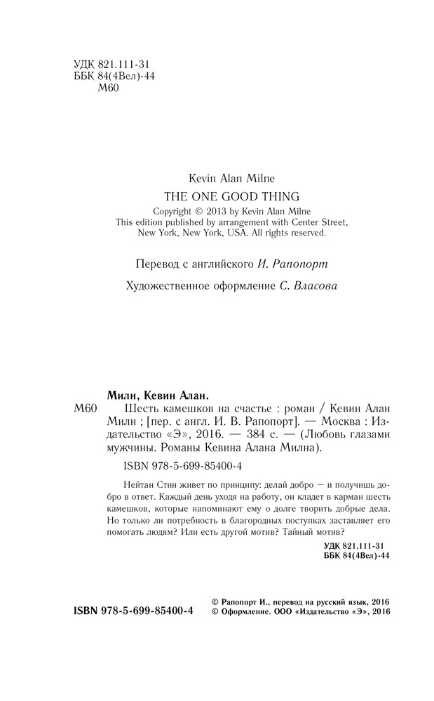 Шесть камешков на счастьеВ данный момент этот товар отсутствует в продаже. Возможно, у нас найдется аналогичный или похожий товар здесь. Серия: Любовь глазами мужчины. Романы Кевина Алана Милна Нейтан Стин живет по принципу: делай добро — и получишь добро в ответ. Каждый день уходя на работу, он кладет в карман шесть камешков, которые напоминают ему о долге творить добрые дела. Но только ли потребность в благородных поступках заставляет его помогать людям? Или есть другой мотив? Тайный мотив? |