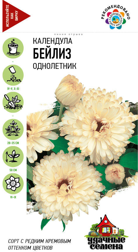 💳 Оплатить за товар можно при получении 🇰🇿 Есть бесплатная доставка по Казахстану от 1 дня 🎁 Копите бонусы с каждой покупки Серия: Удачные семена Популярное, неприхотливое растение из семейства Астровые, высотой 50 см. Соцветия махровые, кремово-белой окраски, диаметром 7–8 см. Обильно и продолжительно цветет, особенно если своевременно удалять отцветшие соцветия. Календула светолюбива и предпочитает легкие почвы, холодостойка — выдерживает заморозки до −5°C. Размножают прямым посевом в грунт. Всходы появляются через 7–10 дней, их через некоторое время прореживают, оставляя расстояние между растениями 20 — 25 см. Используют для оформления участка, выращивания в балконных ящиках, срезки. |