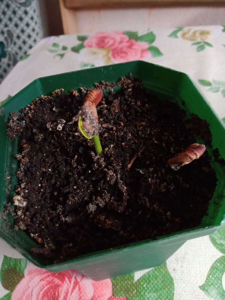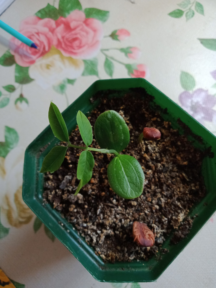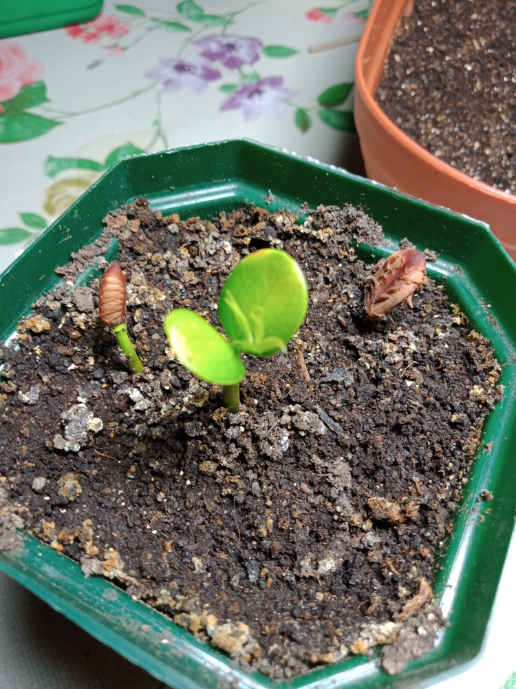 Взошли все три семени.Садила в лёгкий грунт добавляла вермикулит.Шапочки скинул один росток,остальным буду помогать предварительно смочив спонжик в тёплой воде и обмотав семечки.Спонжик обрезаю 2×2см.