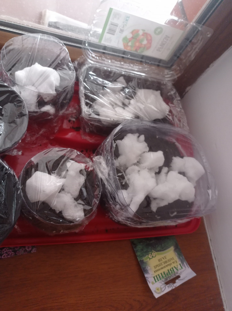Посадила все семена, их очень много, надо было половину отложить, но я сразу замочила в снегу все семена. Оставила на сутки, половина выплыла, на фото на тряпочке справа те, что остались на дне, посушила пол часа на тряпочке, и посадила, сначала дренаж, потом грунт, грунт увлажнила опрыскивателем, сверху семена, и немного насыпала грунт и ещё сверху насыпала снег и укрыла клеенкой пищевой, если взойдут напишу, спасибо.