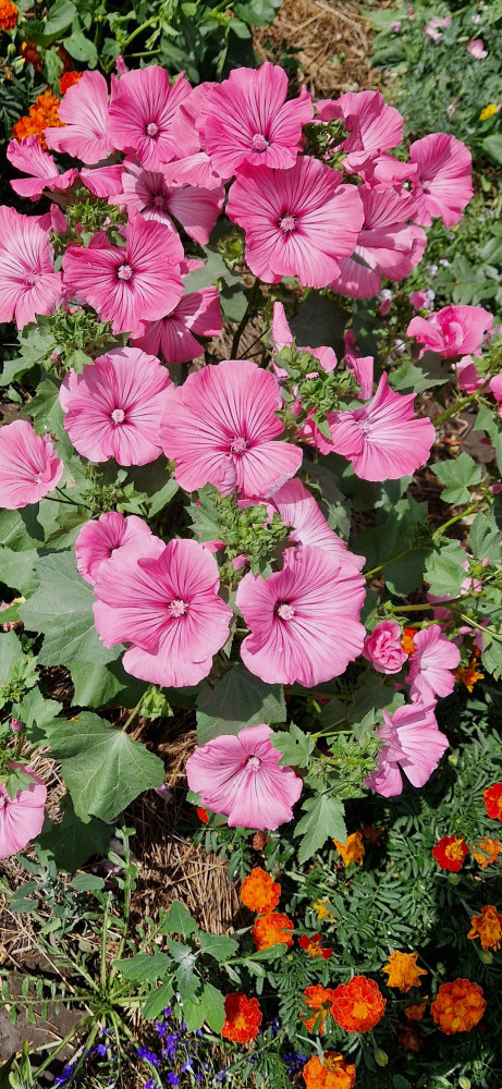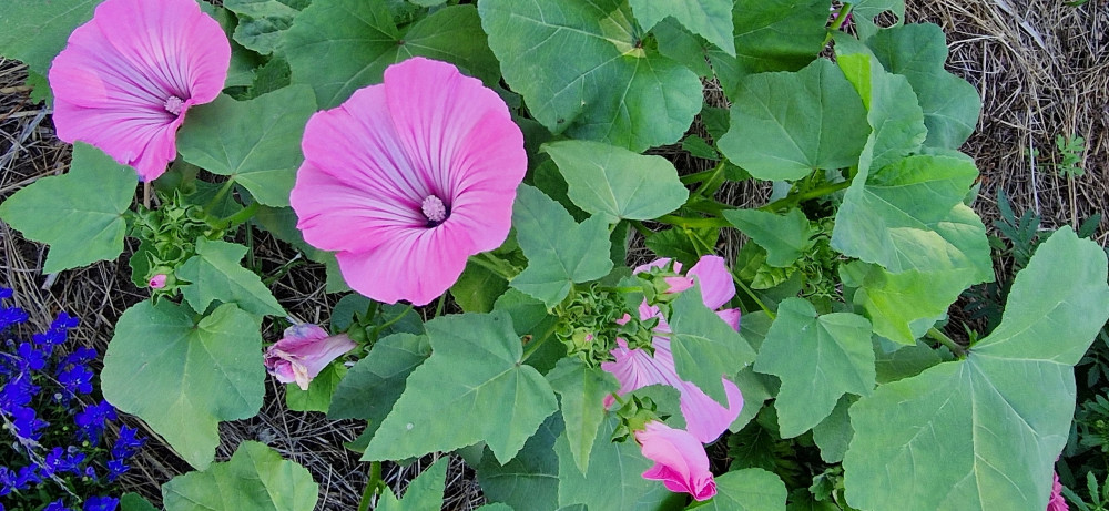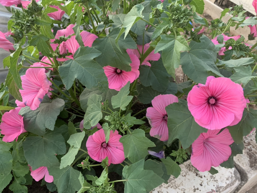 Очень много цветов. В прошлом году сажала другую розовую лаватеру, была поскромнее. Эта же очень яркая, многоцветковая, листьев не видно.