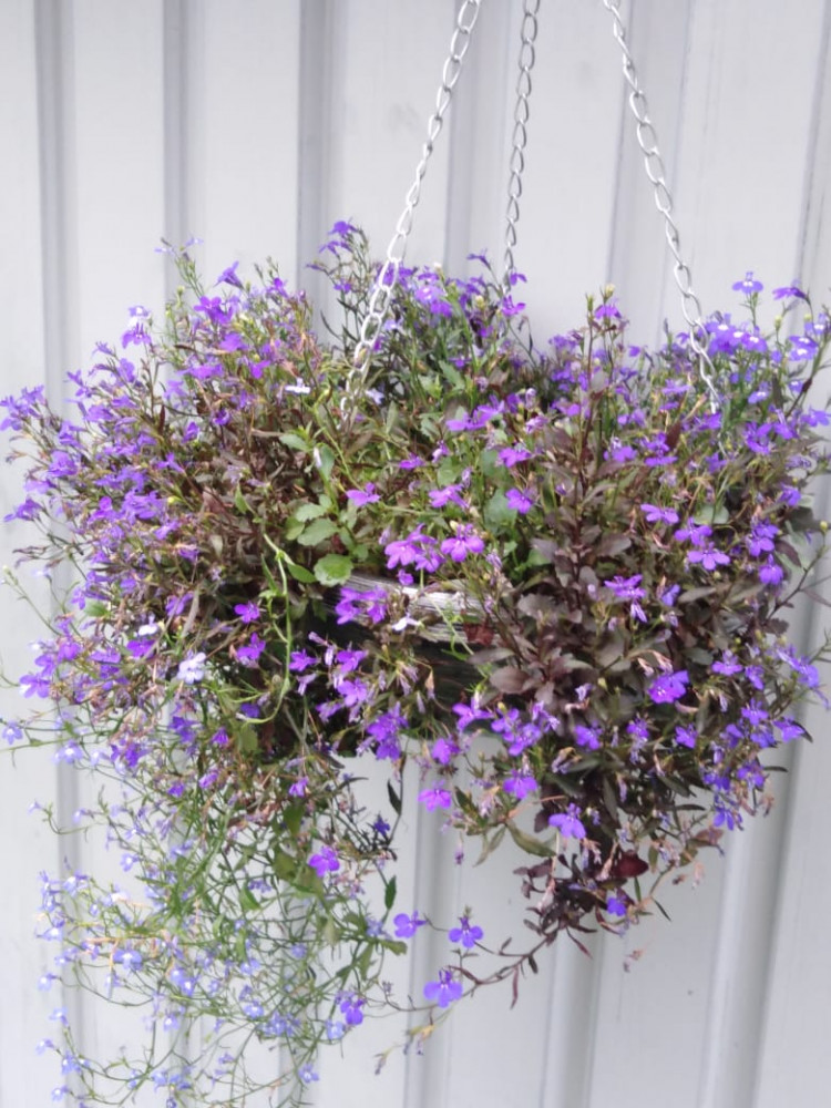 Понравился сорт. Нарастает красивыми шапками в меру свисает с кашпо. Все же в горшок нужно садить по гуще. На фото цветопередача искажена, цвет тёмно голубой. Фото на дереве - начало цветения, на заборе в полную силу, с лева снизу в этом кашпо попался ампельный сорт , кстати можно сравнить длину. Лучше сажать в полу тень, на полном солнце возле мет. забора в июле пропал кустик!