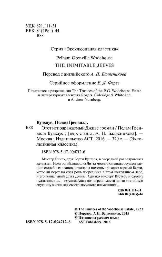 Серия: Эксклюзивная классика Мистер Бинго, друг Берти Вустера, в очередной раз задумывает жениться. Но строгий дядюшка Литтл может помешать осуществлению свадебных планов, и тогда на помощь приходят верный Берти, который берет на себя роль посредника в этом щекотливом деле, и его гениальный слуга Дживс. Однако мистеру Вустеру и самому нужна помощь — тетушка Агата полна решимости найти достойную спутницу жизни для своего любимого племянника… |