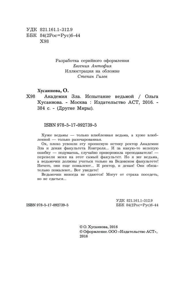 Академия Зла. Испытание ведьмойВ данный момент этот товар отсутствует в продаже. Возможно, у нас найдется аналогичный или похожий товар здесь. Серия: Другие миры Хуже ведьмы — только влюбленная ведьма, а хуже влюбленной — только разочарованная. |
