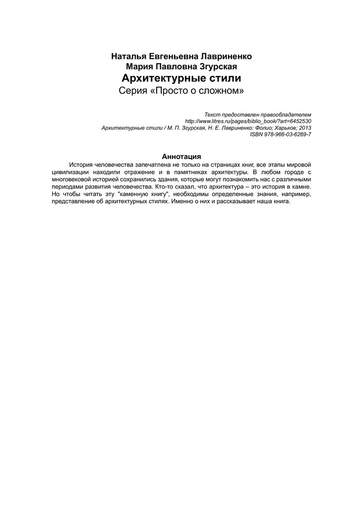 Архитектурные стилиНаталья Евгеньевна Лавриненко, Мария Павловна Згурская В данный момент этот товар отсутствует в продаже. Возможно, у нас найдется аналогичный или похожий товар здесь. Серия: Просто о сложном История человечества запечатлена не только на страницах книг, все этапы мировой цивилизации находили отражение и в памятниках архитектуры. В любом городе с многовековой историей сохранились здания, которые могут познакомить нас с различными периодами развития человечества. |