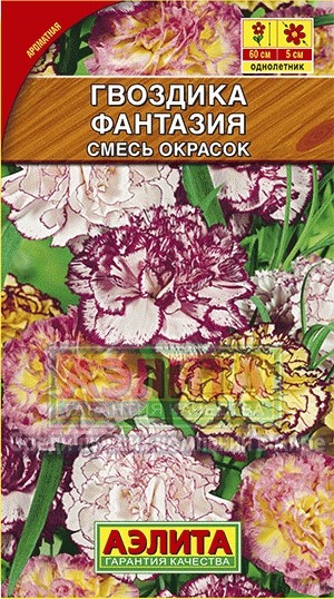 В данный момент этот товар отсутствует в продаже. Возможно, у нас найдется аналогичный или похожий товар здесь. Серия: Однолетние цветы (Аэлита) Прекрасная срезочная культура высотой 60 см. Смесь представлена роскошными расцветками. Большое количество густомахровых соцветий Ø5-6 см с приятным, сильным ароматом распускается на растениях с июля до морозов. Высокий бордюр, вазоны и цветники будут великолепно украшены, если в них растет гвоздика ФАНТАЗИЯ. Чтобы продлить период цветения, перед первыми заморозками растения с комом земли пересаживают в горшок и заносят в теплицу. Незаменимая горшечная культура для выгонки в зимний период.
